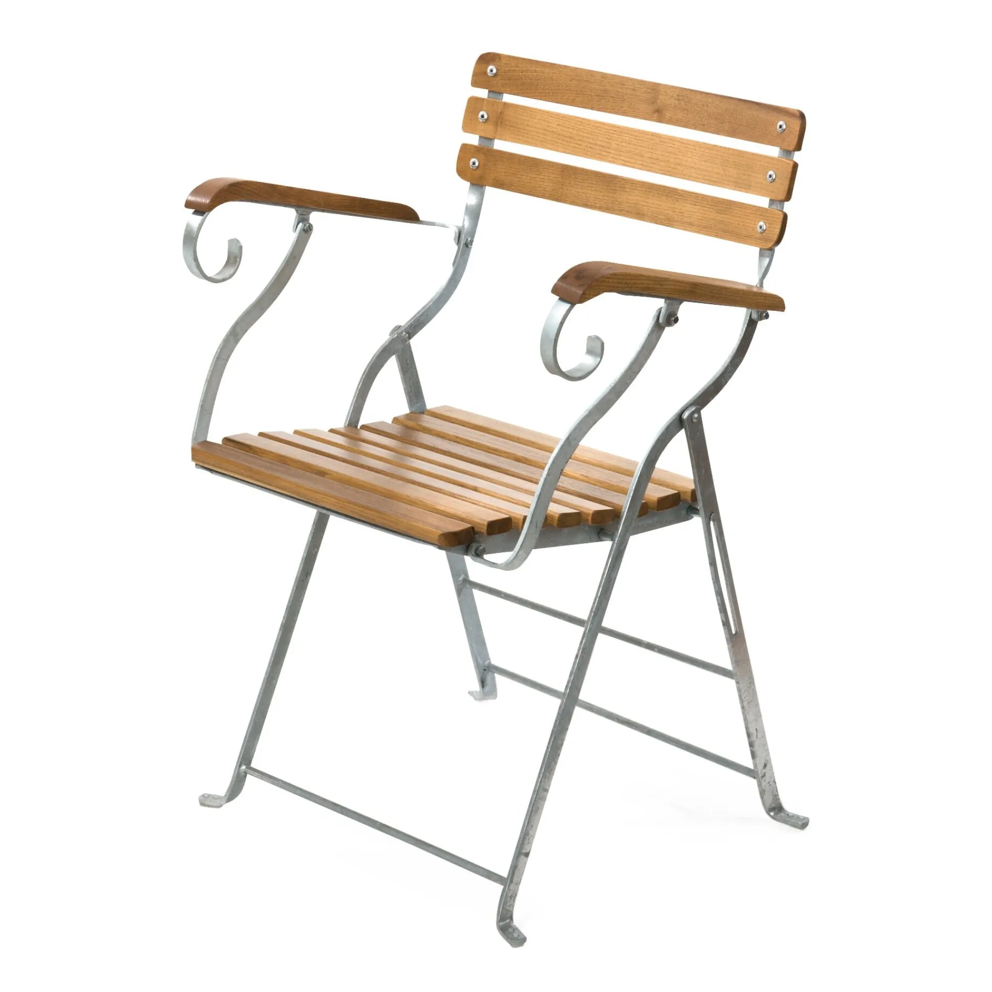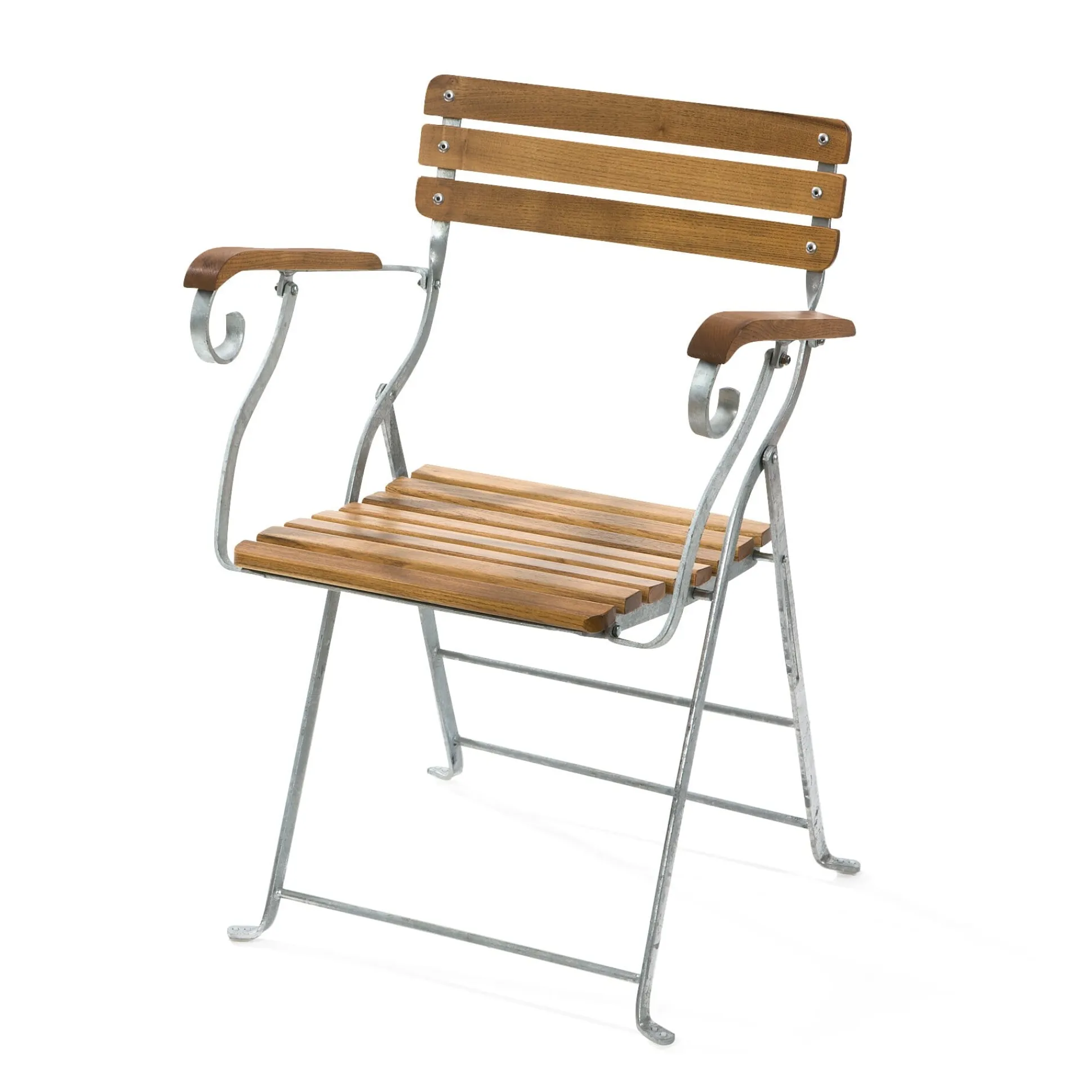 Komfortabler Sessel mit Armlehnen, der auch auf dem Balkon nicht allzu raumgreifend wirkt. Bandstahl feuerverzinkt, Robinienholz geölt. Höhe 80 cm, Breite 54 cm, Tiefe 54 cm. Sitzfläche 39 × 39 cm. Sitzhöhe 45 cm. Klappmaße 105 × 54 × 15 cm. Gewicht 11 kg.