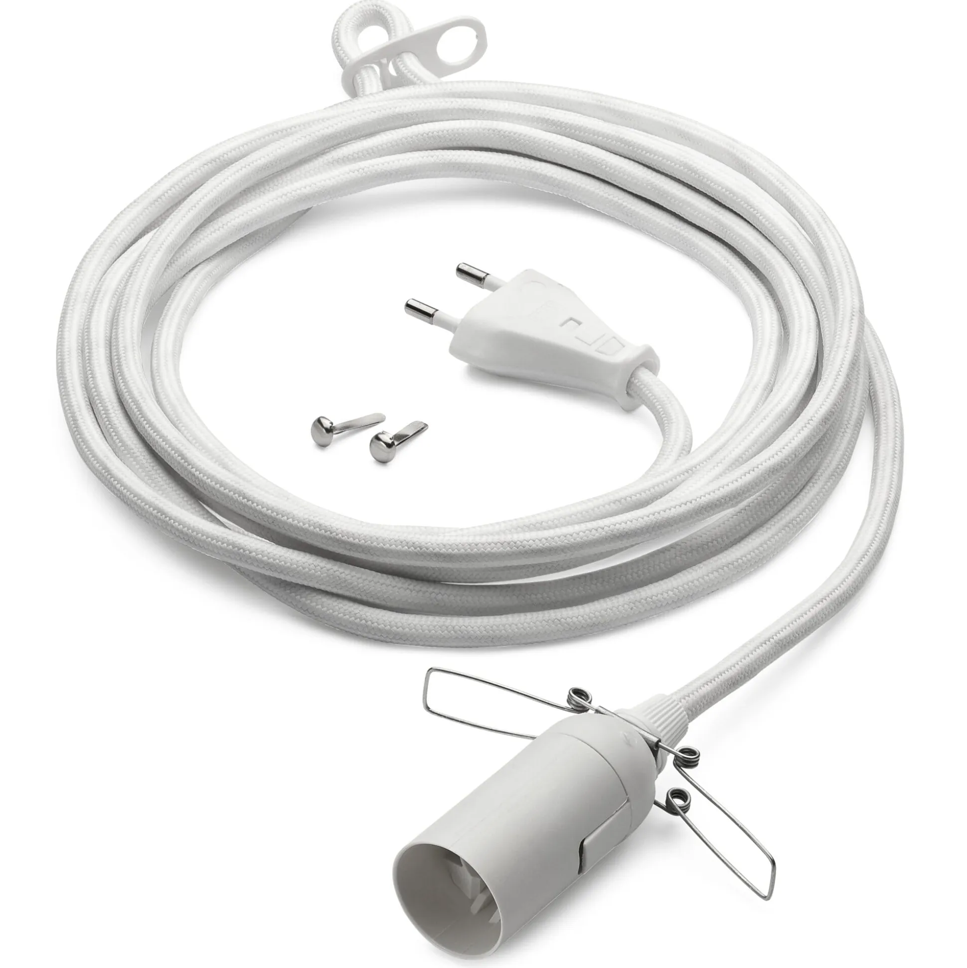 Textilummanteltes Kabel, Länge 4 m, Eurostecker. Kunststofffassung E14 (max. 40 W). Mit 2 Klammern zur Befestigung. Lieferung ohne Leuchtmittel.