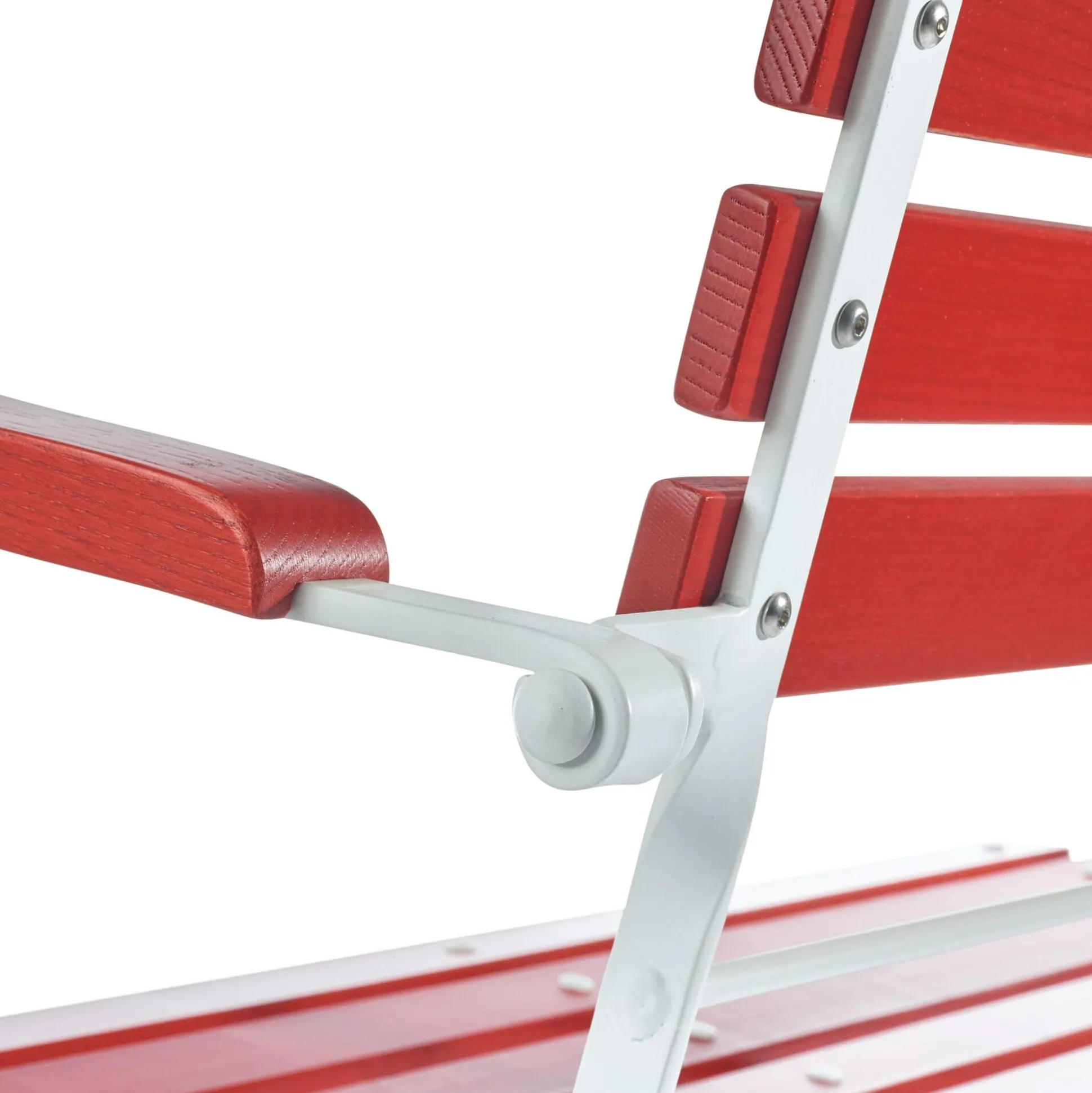 Klassisch an dieser Gartenbank ist neben der geschwungenen Form der Sitz- und Anlehnfläche, auf der es sich auch ohne Polster oder Unterlage bequem sitzen lässt, auch die Farbkombination aus leuchtendem Rot und hellem Weiß. Recht ungewöhnlich für ein Gartenmöbel diesen Ausmaßes ist, dass es sich so schmal zusammenklappen lässt.