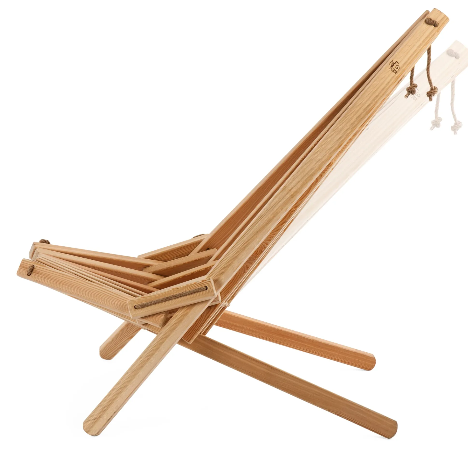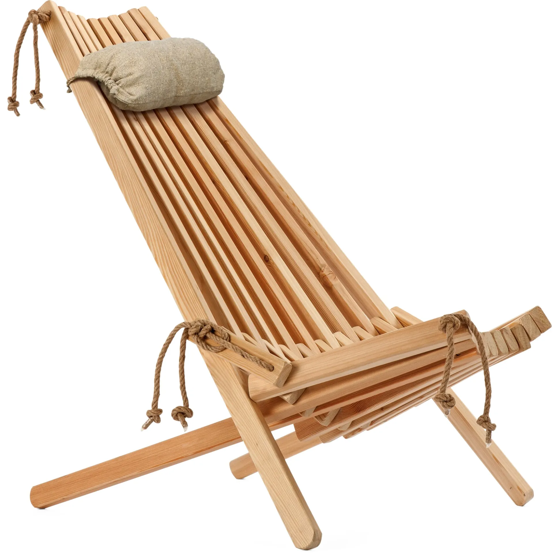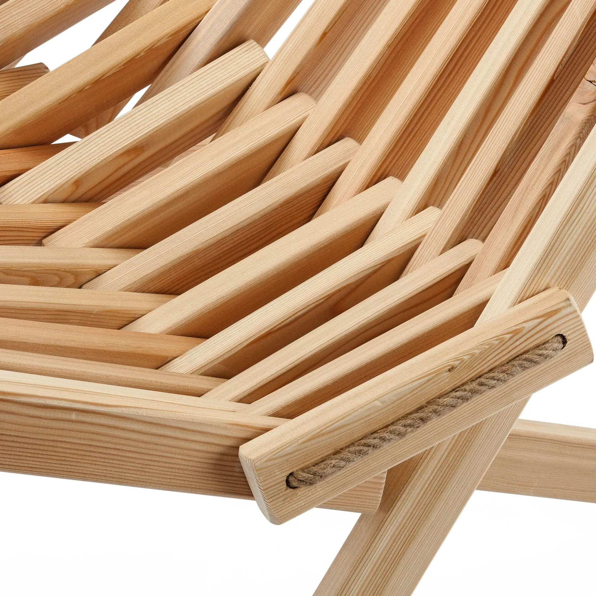 Zwei mögliche Sitzpositionen kennt dieser Sessel. Sie haben’s in der Hand, denn Sie bauen sich das Möbel selbst zusammen. Je nachdem, wie straff Sie die Halt gebenden Seile aus Hanf spannen, sitzen Sie eher aufrecht – oder aber bequem zurückgelehnt. Und ob nun windschiefer Altbau-Parkettboden drinnen oder unebener Untergrund auf der Wiese draußen, die Seilkonstruktion ist in jeder Situation von Vorteil, da sie den Ausgleich ermöglicht. So kann der Sessel kaum ins Kippeln geraten, ganz egal, wo Sie ihn aufstellen. Auch das für die Leisten verwendete Holz ist durchaus außentauglich. Erlenholz beweist seine Dauerhaftigkeit üblicherweise in Unterwasser-Holzkonstruktionen, traditionell werden etwa Stützpfähle daraus gemacht. Für unseren Faltsessel lassen wir das Holz eigens mit einem Pflegeöl vorbehandeln. Diesen pflegenden „Anstrich“ sollten Sie in regelmäßigen Abständen erneuern und das Holz säubern, um seine Haltbarkeit zu verlängern und es auch optisch aufzufrischen. Unser Hersteller in Estland bezieht es einem Betrieb in der Nachbarschaft.