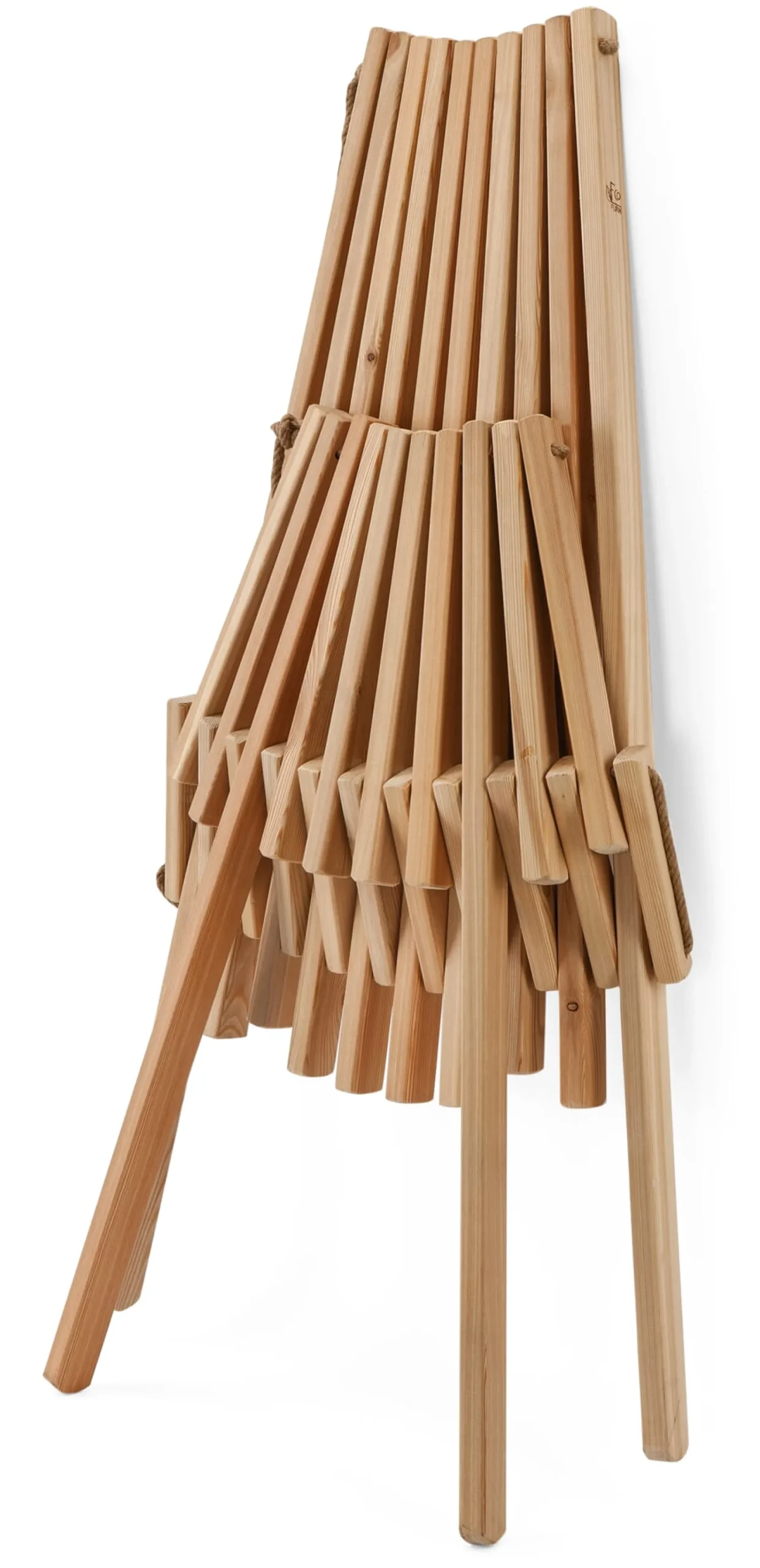 Erlenholz (Herkunft Estland) geölt. Seile aus Hanf. Hergestellt in Estland. Sitzhöhe vorne 38 cm, Sitztiefe 46 cm. Höhe 98 cm, Breite 54 cm, Tiefe 100 cm. Gewicht 12,2 kg. Belastungsgewicht max. 140 kg.