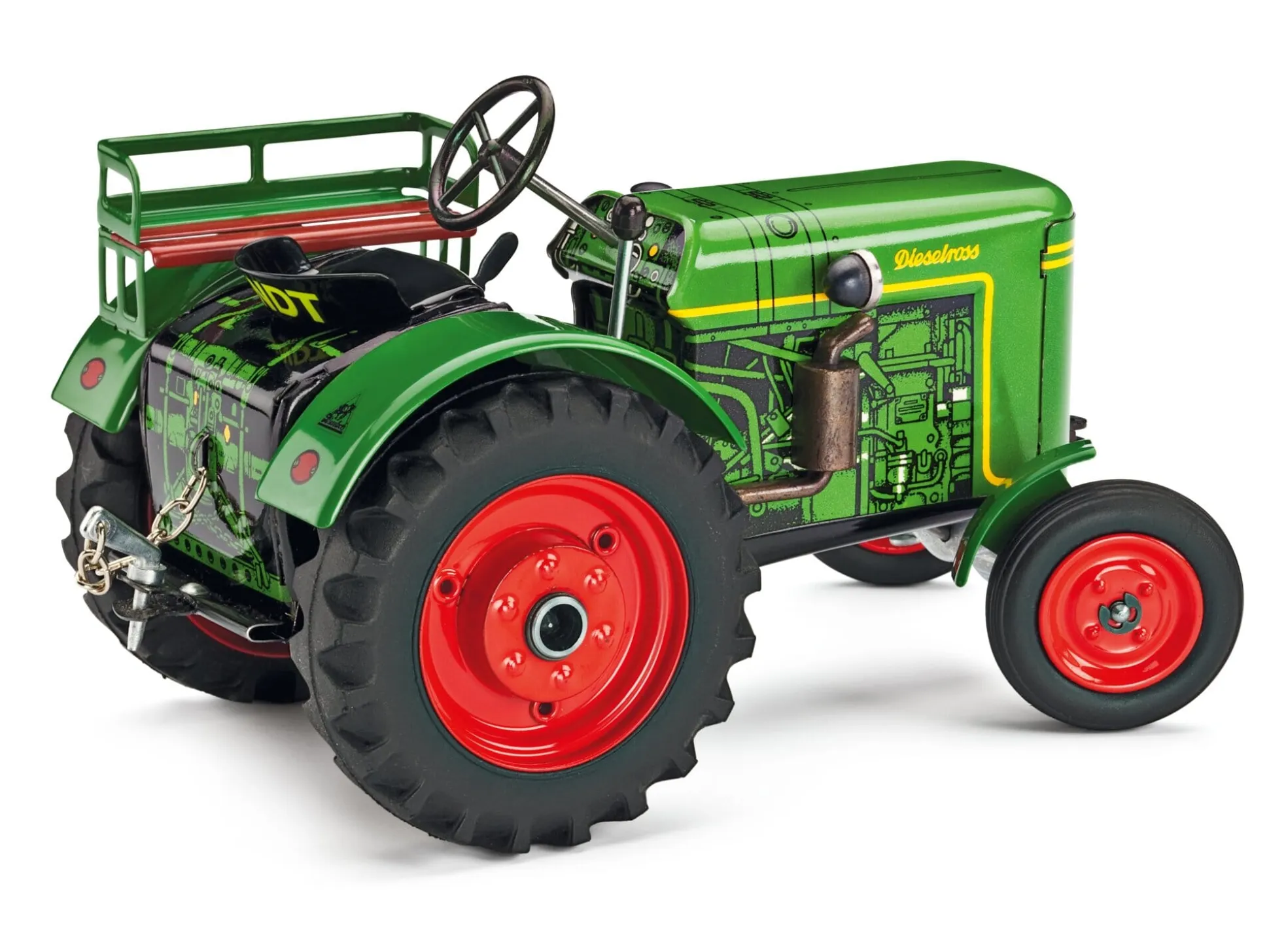 Originalgetreue Nachbildung des Fendt F20 im Maßstab 1:25. Ab 3 Jahre. Lackiertes Stahlblech, echte Gummireifen auf Metallfelgen. Aufziehbarer Federwerkmotor, drei Vorwärtsgänge, ein Rückwärtsgang. Funktionierende Lenkung, Handbremse. Hergestellt in Tschechien.