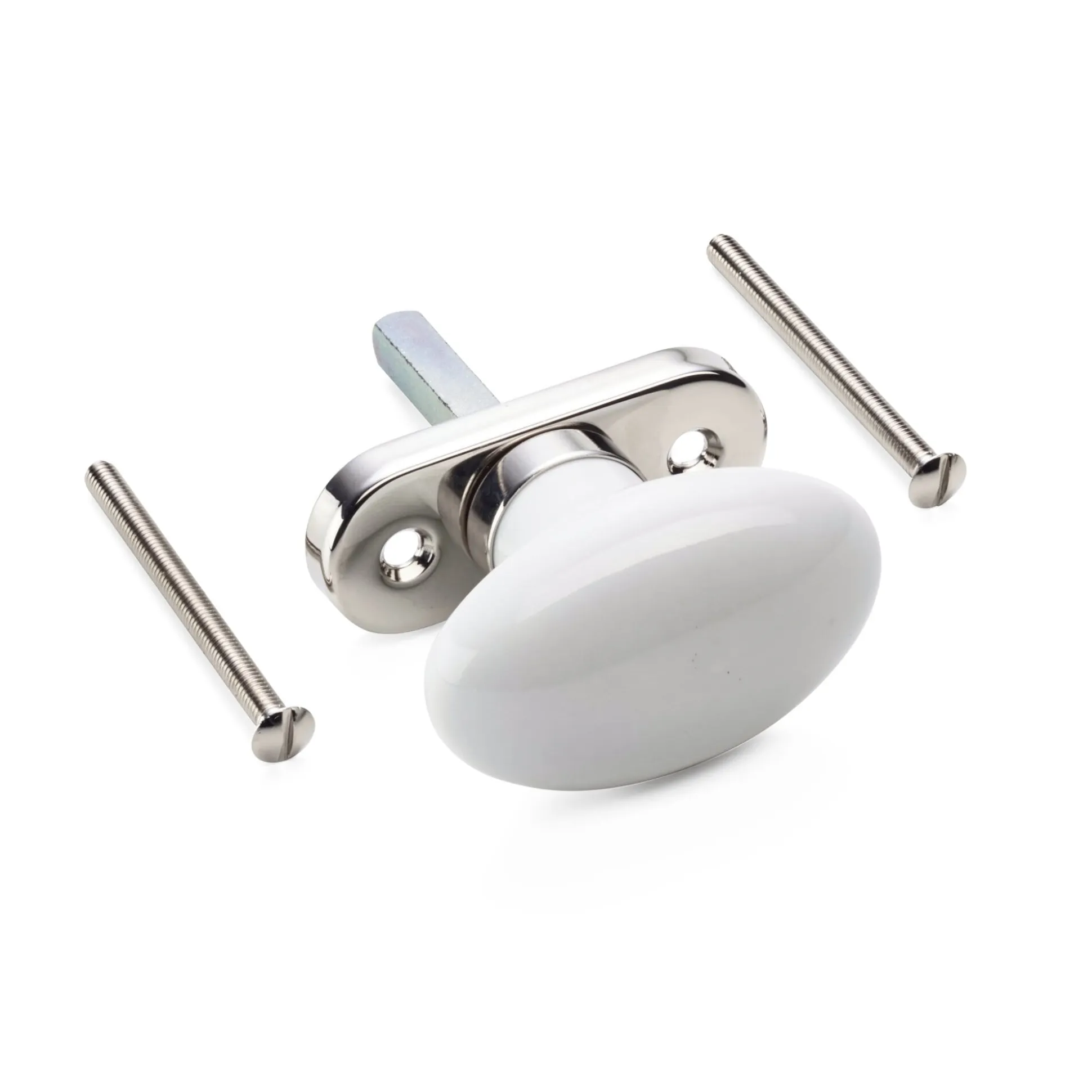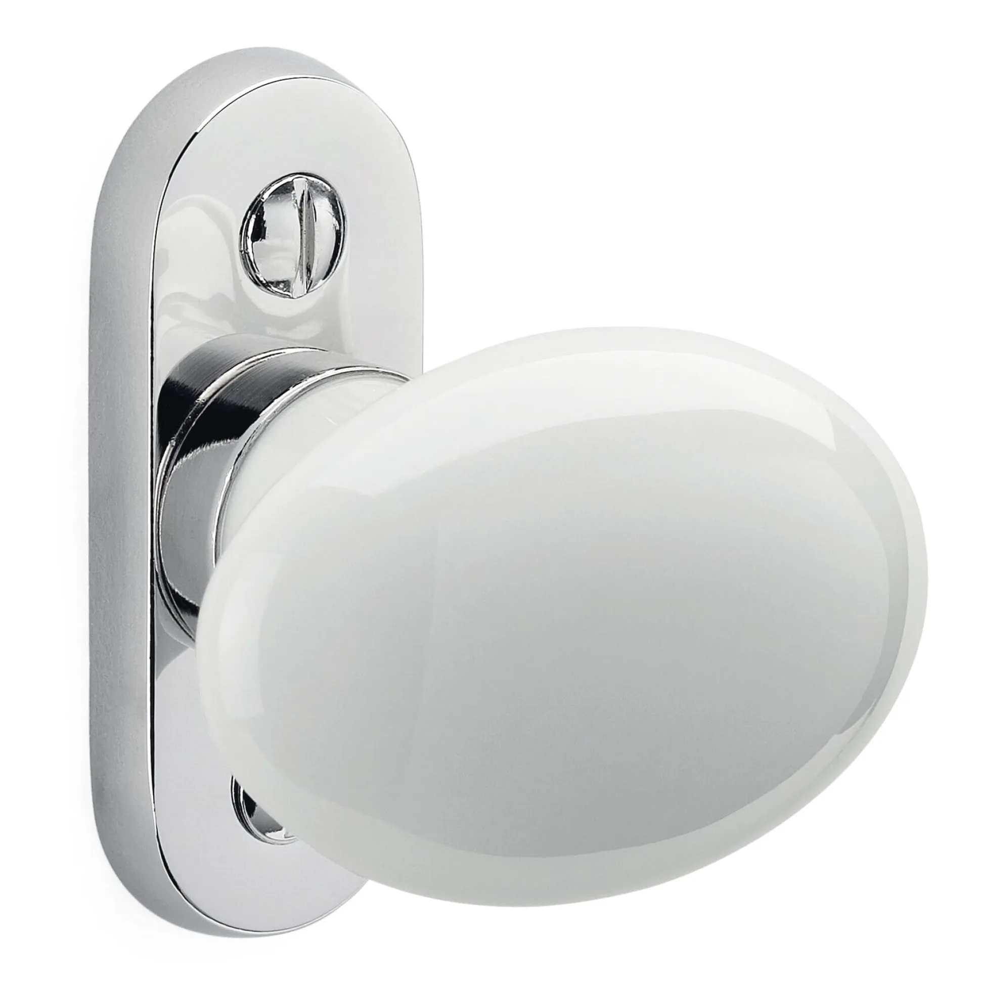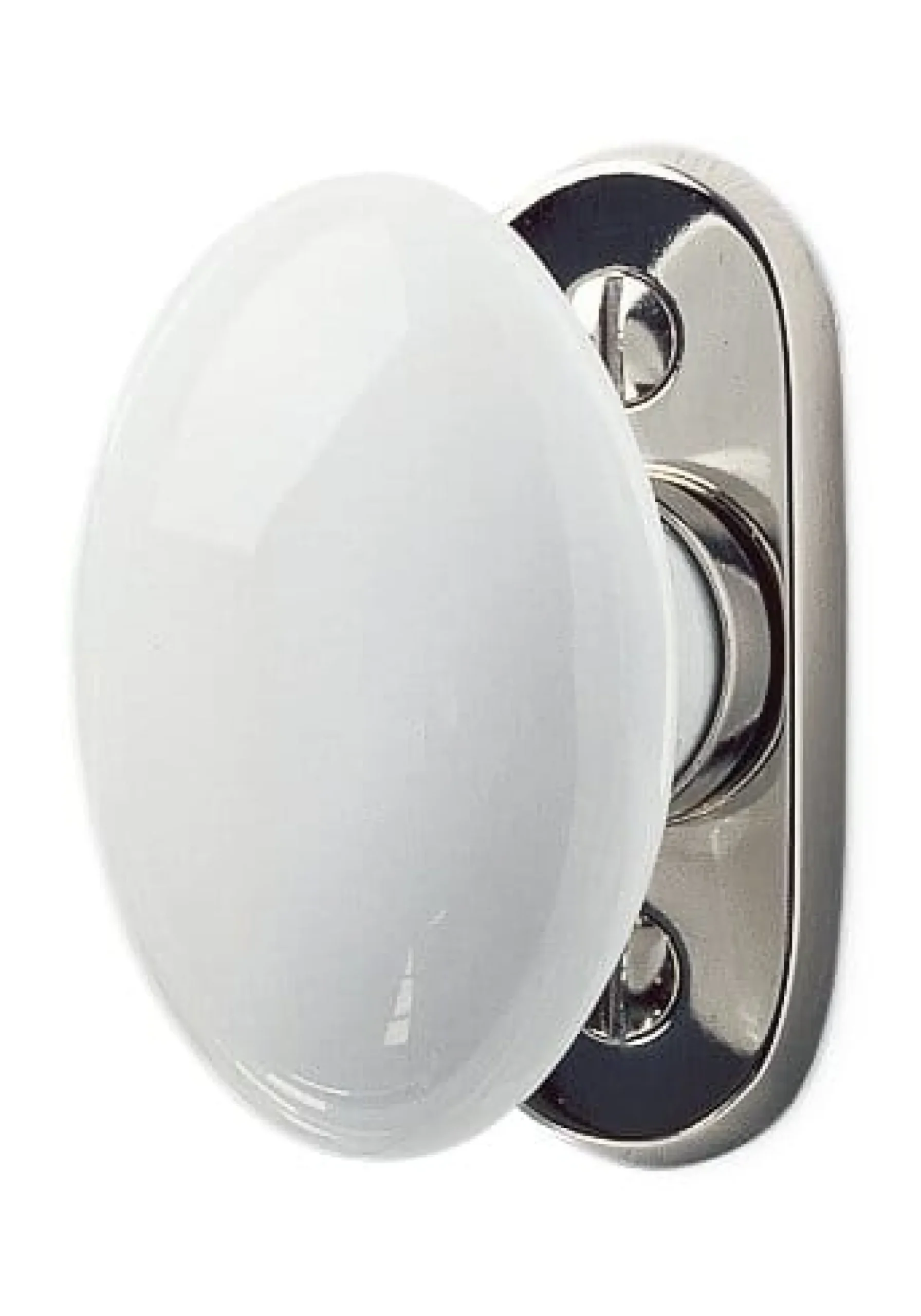 1 Fensterolive Porzellan, Rosette Messing massiv, vernickelt. Länge Olive 6,5 cm, Breite 4 cm. Rosette 7 x 3 cm, Lochmittenabstand 4,3 cm. Gewicht 170 g. Schrauben liegen bei.