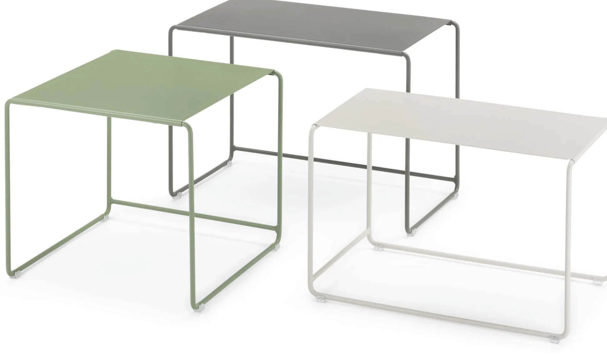 Ein Ensemble, das mit dynamischer Leichtigkeit und frischen Farben überzeugt: Mit diesen Terrassentischen holt der französische Möbelhersteller Fermob das spätestens seit Josef Albers geschätzte Prinzip der Satztische nach draußen. Ob einzeln oder im Verbund, ob zusammengeschoben oder nebeneinandergestellt, ergeben die drei Terrassentische eine ganz nach Bedarf vergrößer- und verkleinerbare Abstellfläche. Zwei Tische mit quadratischer und ein Tisch mit rechteckiger Tischplatte auf filigranen Stahlrohrgestellen lassen Ihnen im wahrsten Sinne des Wortes genug Spielraum für verschiedenste Kombinationsmöglichkeiten. Typisch Fermob, ist das Satztisch-Trio dennoch für alle Wetter gerüstet, da die in mehreren Arbeitsschritten aufwändig aufgetragene Lackierung für einen dauerhaften Rost- und Farbschutz sorgt. Alors – fröhliches Kombinieren! Das übrigens auch drinnen, denn dass diese Tische auch im Wohnbereich eine gute Figur machen, versteht sich ja von selbst.