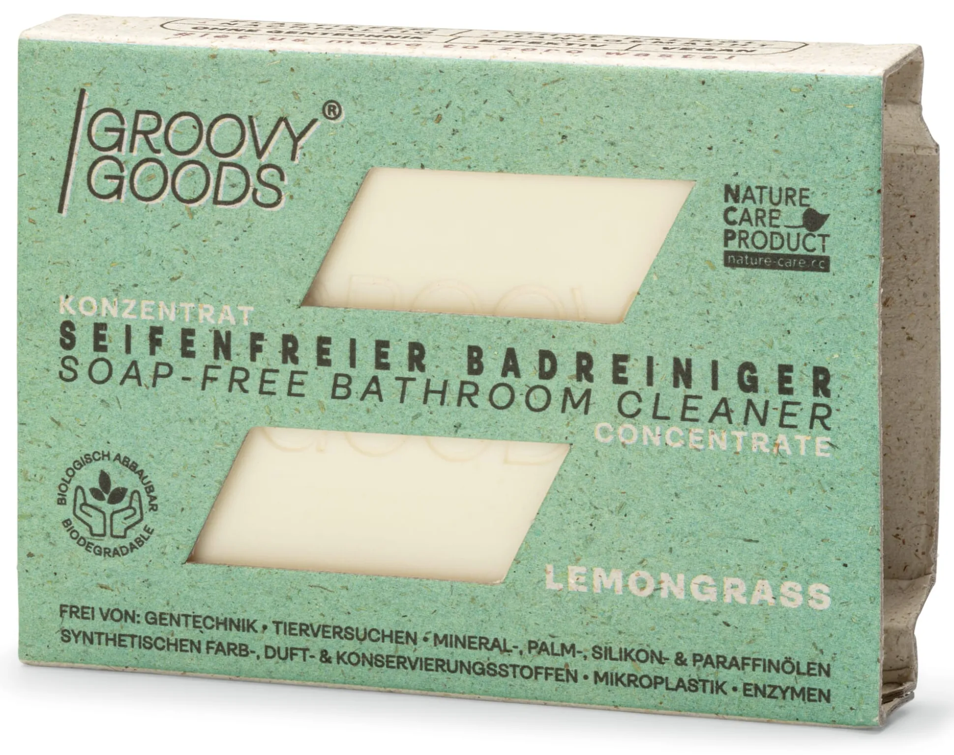 Dieser feste Badreiniger gehört zu einer Reihe von Haushaltsreinigern, die in Form einer Stückseife hergestellt werden. Sie enthalten ausschließlich pflanzliche Inhaltsstoffe und auch die Tenside werden auf pflanzlicher Basis gewonnen. Da die Tenside sehr mild sind, schäumen sie weniger, als man es von konventionellen Reinigern gewohnt ist, sind aber ebenso kraftvoll. Zudem sind die festen Reiniger von Groovy Goods konzentriert und daher so ergiebig wie 750 Milliliter Flüssigreiniger und ebenso einfach in der Anwendung: Mit einem nassen Lappen oder Schwamm über den festen Badreiniger reiben, bis es schäumt, dann auf die zu reinigenden Flächen auftragen, kurz einwirken lassen und klar nachspülen und trockenwischen. Dank der festen Konsistenz kann der Badreiniger in einer Verpackung aus Graskarton geliefert werden, das spart Plastikmüll und Transportkosten, außerdem benötigt er weniger Platz bei der Lagerung. Nach dem Gebrauch sollte der feste Badreiniger stets gut trocknen können, am besten in einer Seifenschale mit Abflusslöchern.