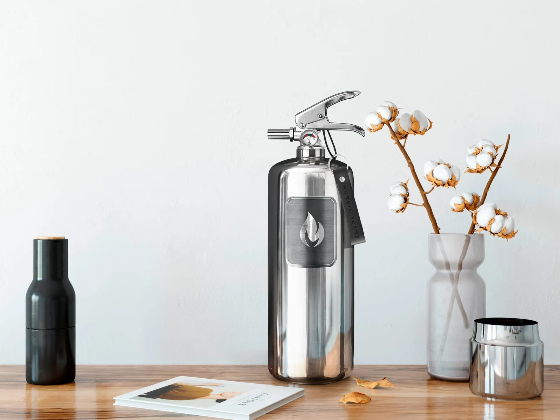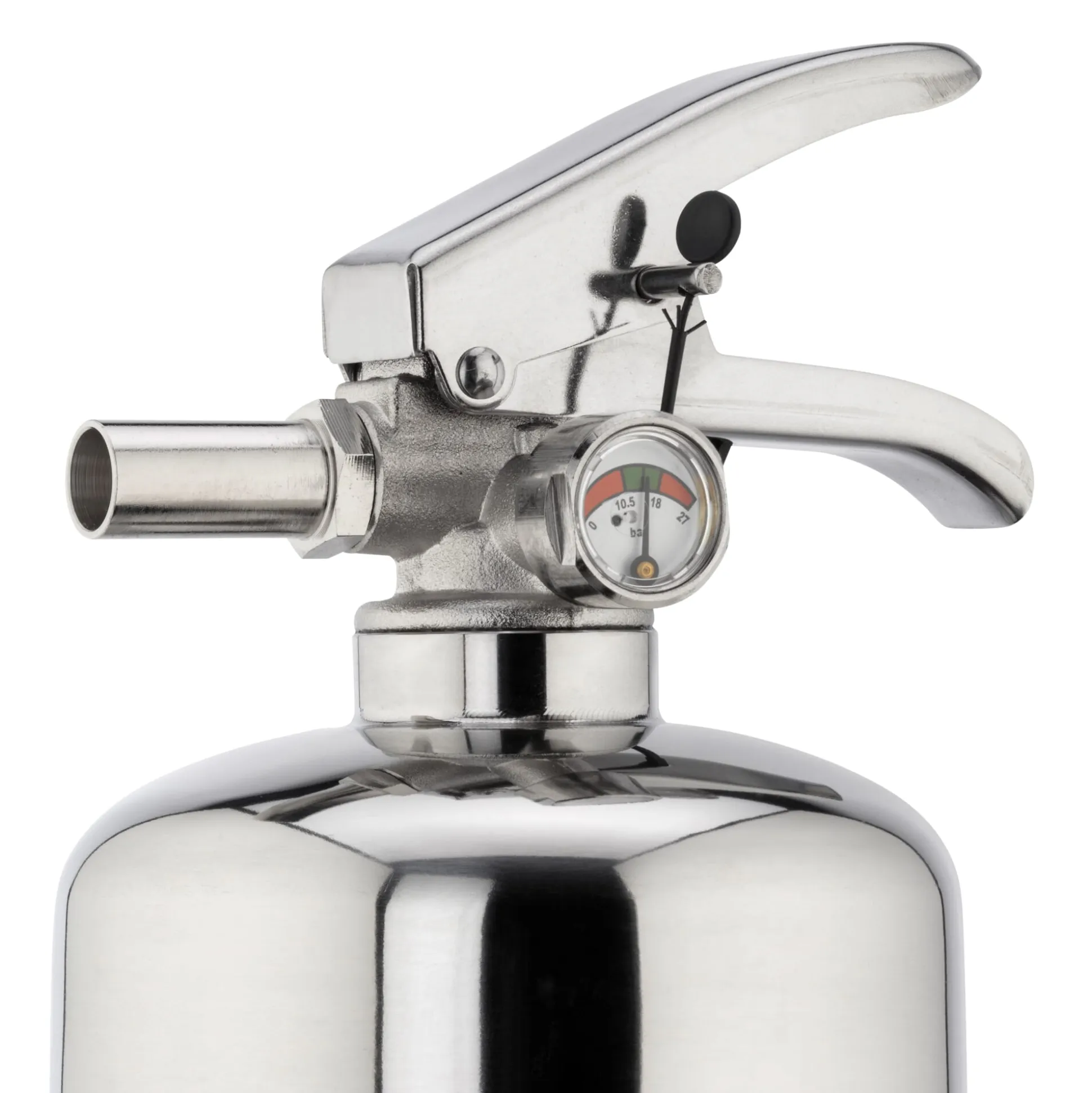 Aus handpoliertem Edelstahl hergestellt und mit einem schwarzen Lederstrap (zum Entsichern) versehen, glänzt er aber nicht nur mit klarem Design, sondern natürlich auch mit seinen inneren Werten: Der Feuerlöscher ist mit ABC-Pulver gefüllt und damit für die Brandklassen A, B und C geeignet: