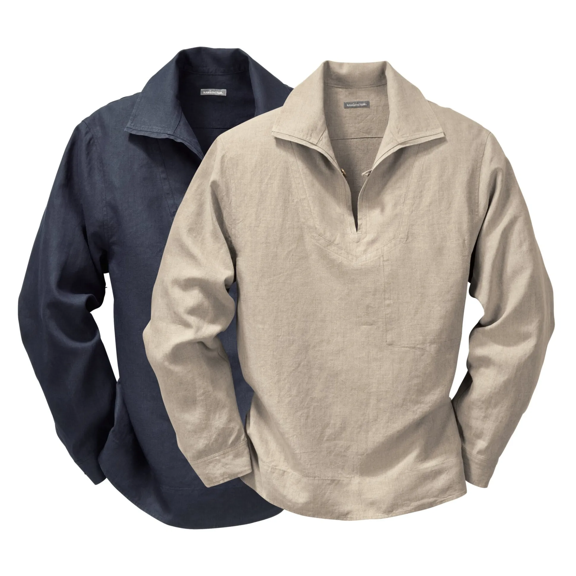 Dieses ursprüngliche Fischerhemd in Form einer klassischen Vareuse, was wörtlich übersetzt Hemdbluse heißt, ist in der Form äußerst einfach – mit einem Einsatz, einem Schlitz und einem umzuschlagenden Einstückkragen. Um bei der Arbeit nirgendwo hängenzubleiben, haben Fischerhemden traditionell keine vorstehenden Knöpfe. Wir haben uns daran gehalten: Der einzelne Knopf, der mitsamt einer Schlaufe den Schlitz am Halsausschnitt schließt, sitzt innen, die Brusttasche liegt ebenfalls innen. Früher wurde solch ein Hemd aus Segeltuchresten geschnitten, was für heutige Verhältnisse unangemessen schwer wäre. Unser Fischerhemd wird aus Leinen mit einer für Hemden immer noch ungewöhnlich schweren Qualität konfektioniert.
