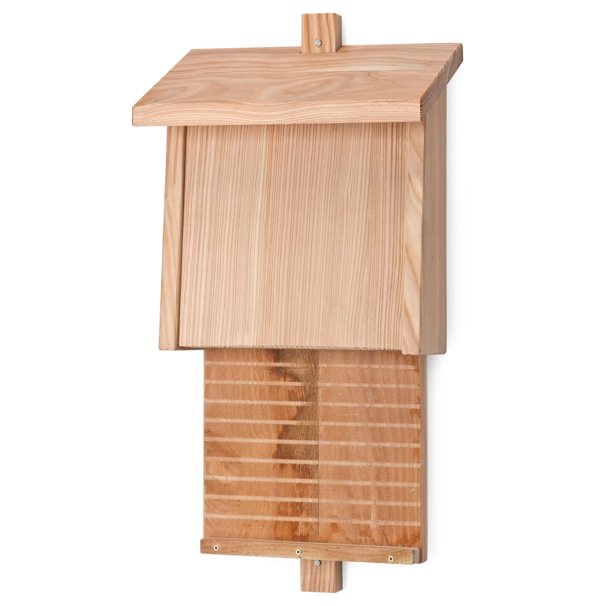 Die bevorzugt in Siedlungsnähe lebenden Fledermäuse sind unauffällige, aber effiziente Insektenvernichter: Auf 1 kg Fliegen, Schnaken und Mücken bringt es eine Fledermaus pro Sommer. Aber die natürlichen Ruheplätze für die Tiere (in Mauerritzen) sind inzwischen rar geworden. Ersatz schafft dieser Spaltenkasten aus Lärchenholz: Die nach unten verlängerte Rückwand bietet genügend Platz für den Anflug; sie ist sägerau belassen und mit eingefrästen Nuten versehen – daran können die Fledermäuse sich gut klammern und Halt finden. Sämtliche Fugen sind sorgfältig verleimt, denn die Tiere vertragen Zugluft nur schlecht. Ihrer Vorliebe für Bauch- und Rückenkontakt entspricht die Form des Holzkastens, der sich nach oben hin verjüngt; die für sie optimale Spaltenbreite können die Tiere selbst herausfinden.