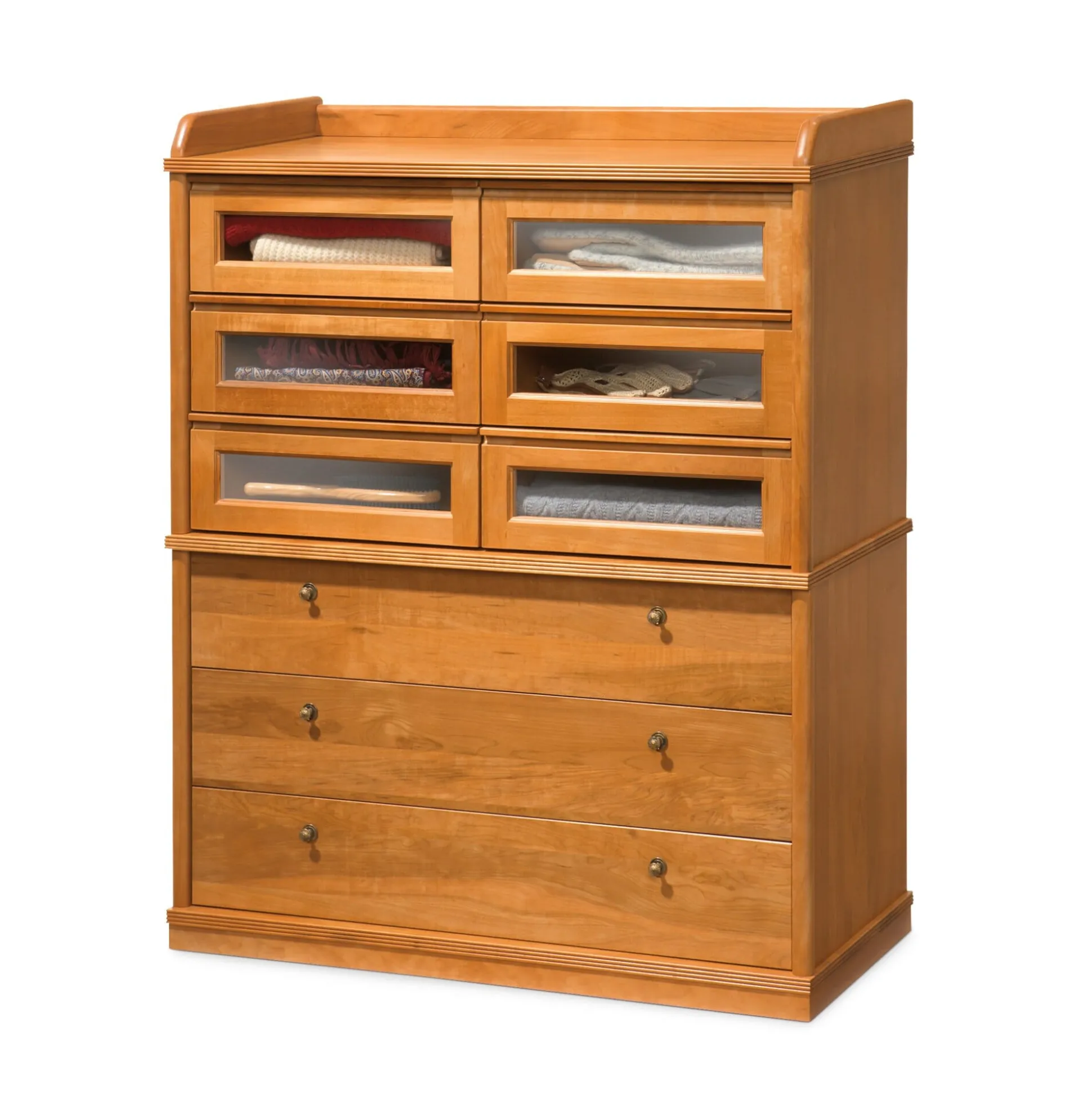 Die unteren 3 Schübe nehmen weniger häufig benötigte Utensilien auf, in den oberen 6 Schüben können Handschuhe, Schals und Kleiderbürsten griffbereit untergebracht werden. Der Inhalt der Schübe ist von außen sichtbar, was einen schnellen, gezielten Zugriff erlaubt. Die Reling verhindert, dass abgelegte Gegenstände seitlich und hinten herunterfallen. B 880 x H 1077 x T 400 mm. Gewicht 59 kg. Lieferung ohne Dekoration.