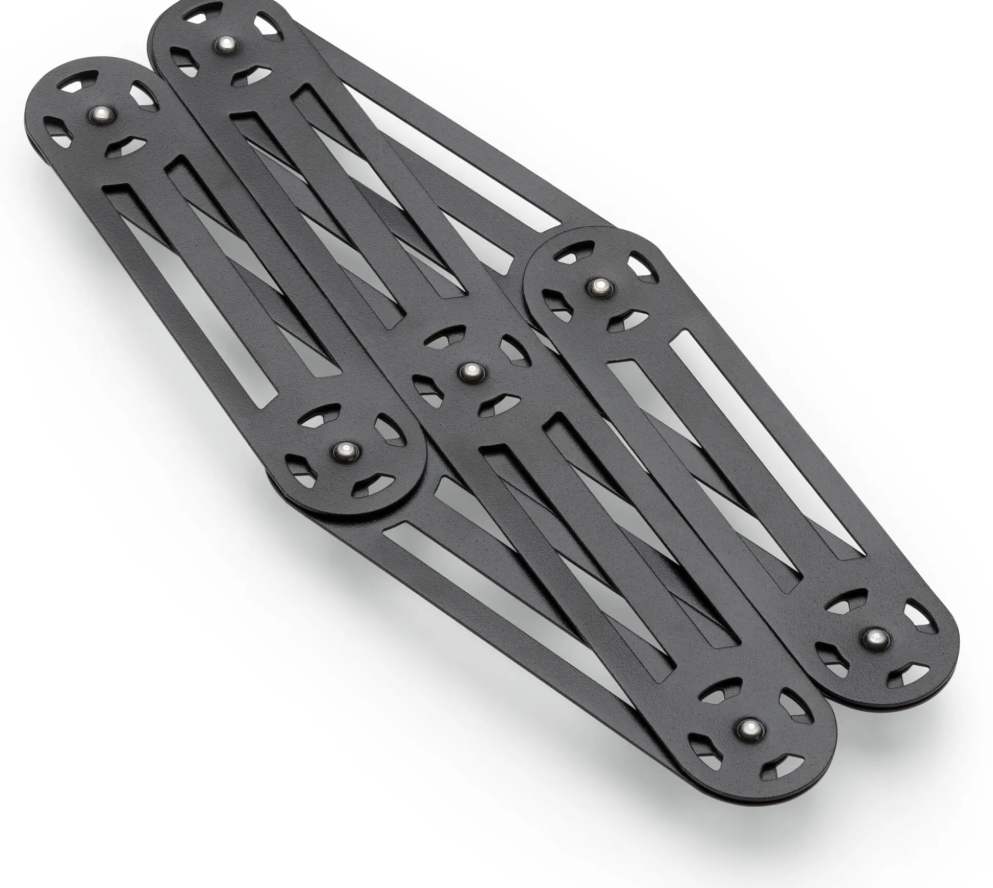 Knifflig bei einem Scherengitteruntersetzer ist natürlich das Gelenk – oder vielmehr die Gelenke, bei unserem Untersetzer sind es sieben an der Zahl. So ein Gelenk soll leichtgängig, dabei verschleißfest sein und nicht auftragen. Wie bei einer Schere ermöglicht es die bewegliche Verbindung von zwei Schenkeln, die sich schließen lassen oder weit bis zum „X“ geöffnet werden können. In der Kombination von zwei oder drei Gelenken auf einem Schenkel entsteht das ziehharmonikaartige Gitter, das sich nach Bedarf auseinanderziehen oder zusammenschieben lässt. Auf der Oberseite ist davon nur die runde Kuppe des Stifts zu sehen, der jeweils den Zusammenhalt gewährleistet. Auf der Unterseite ist der Stift pfiffigerweise zum Fuß ausgebildet. Damit steht der Untersetzer sicher auf seinen sieben Füßen mit bewährtem Abstand zur Unterlage. Wo immer Sie ihn hinstellen, schützt er das Holz der Arbeits- oder Tischplatte, die Leinendecke der feinen Tafel wie die Keramikfliesen des Balkontischs vor der Hitze von Pfanne, Topf und Auflaufform.