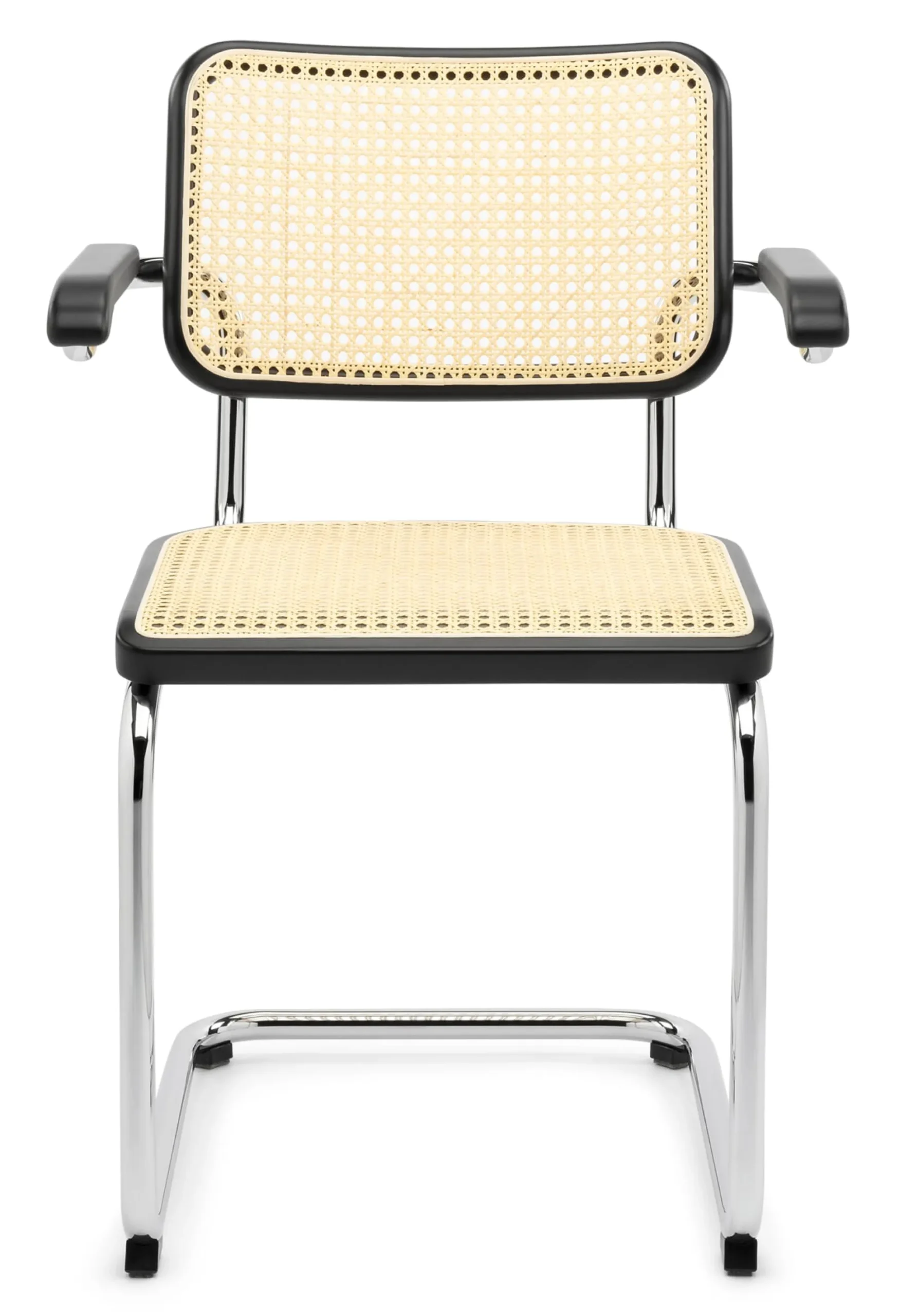 S 64 V. Mit Armlehnen aus Stahlrohr verchromt, Ablagen aus Rotbuchenholz (Herkunft Europa), schwarz gebeizt. Armlehne Länge 30 cm, Breite 4,5 cm. Rückenlehne Breite 45,5 cm, Höhe 30 cm. Sitzfläche 46 × 45 cm, Sitzhöhe 47 cm.