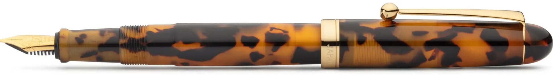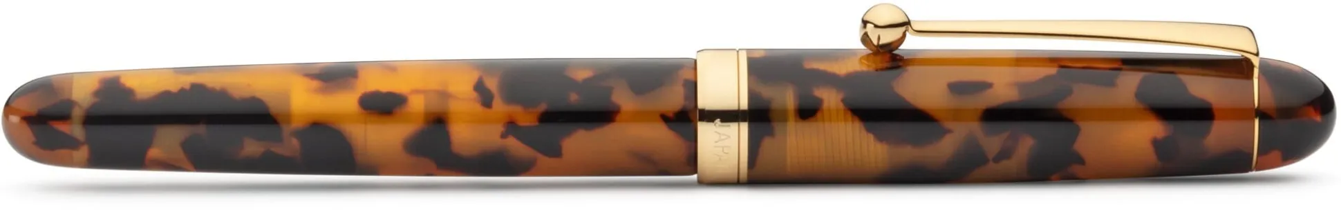 Korpus, aufschraubbare Kappe und Kopfstück aus Zelluloseazetat. Zierring Messing vergoldet. Clip Stahl vergoldet. Stahlfeder vergoldet, Federbreite M. Mit einem Konverter und 2 Standard-Tintenpatronen (blau). Hergestellt in Japan. Länge 13 cm (geschlossen), Ø 12 mm. Gewicht 16 g. Lieferung in einem Geschenkkarton.