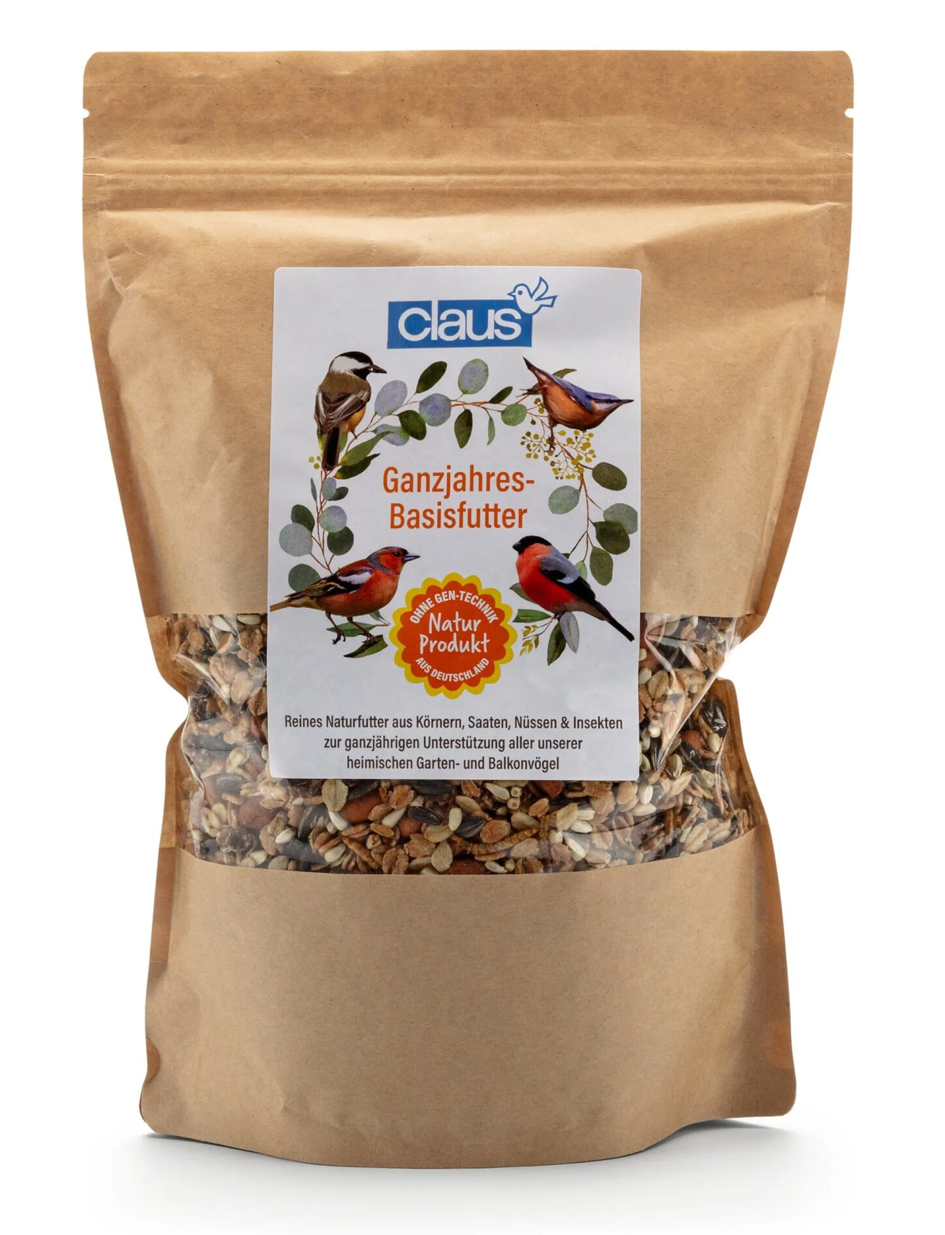 Von dieser Futtermischung profitieren alle bei uns heimischen Wildvögel. Sie kann das ganze Jahr über angeboten werden und enthält neben Körnern, Saaten und Nüssen auch Getreideflocken sowie getrocknete Beeren und Insekten. Weichfutter- und Insektenfresser (Rotkehlchen, Zaunkönig, Amsel, Heckenbraunelle) finden darin genauso das Richtige wie Körnerfresser (Sperlinge, Finken) und Allesfresser (Meisen, Kleiber), die mit dieser Zusammenstellung ebenfalls gut versorgt sind. Ob als Streufutter, im Futterhäuschen oder Futtersilo – die Basismischung eignet sich für sämtliche Darreichungsformen. Die Vögel im Garten nehmen sie genauso gerne an wie der gelegentliche gefiederte Besuch auf dem Balkon in der Stadt. Achten Sie nur darauf, Ihre Futterstelle regelmäßig mit heißem Wasser und einer Reinigungsbürste zu säubern. Nicht nur an warmen Sommertagen freuen die Tiere sich außerdem über eine Vogeltränke, an der sie Erfrischung finden und vielleicht sogar mal ein Bad nehmen können.