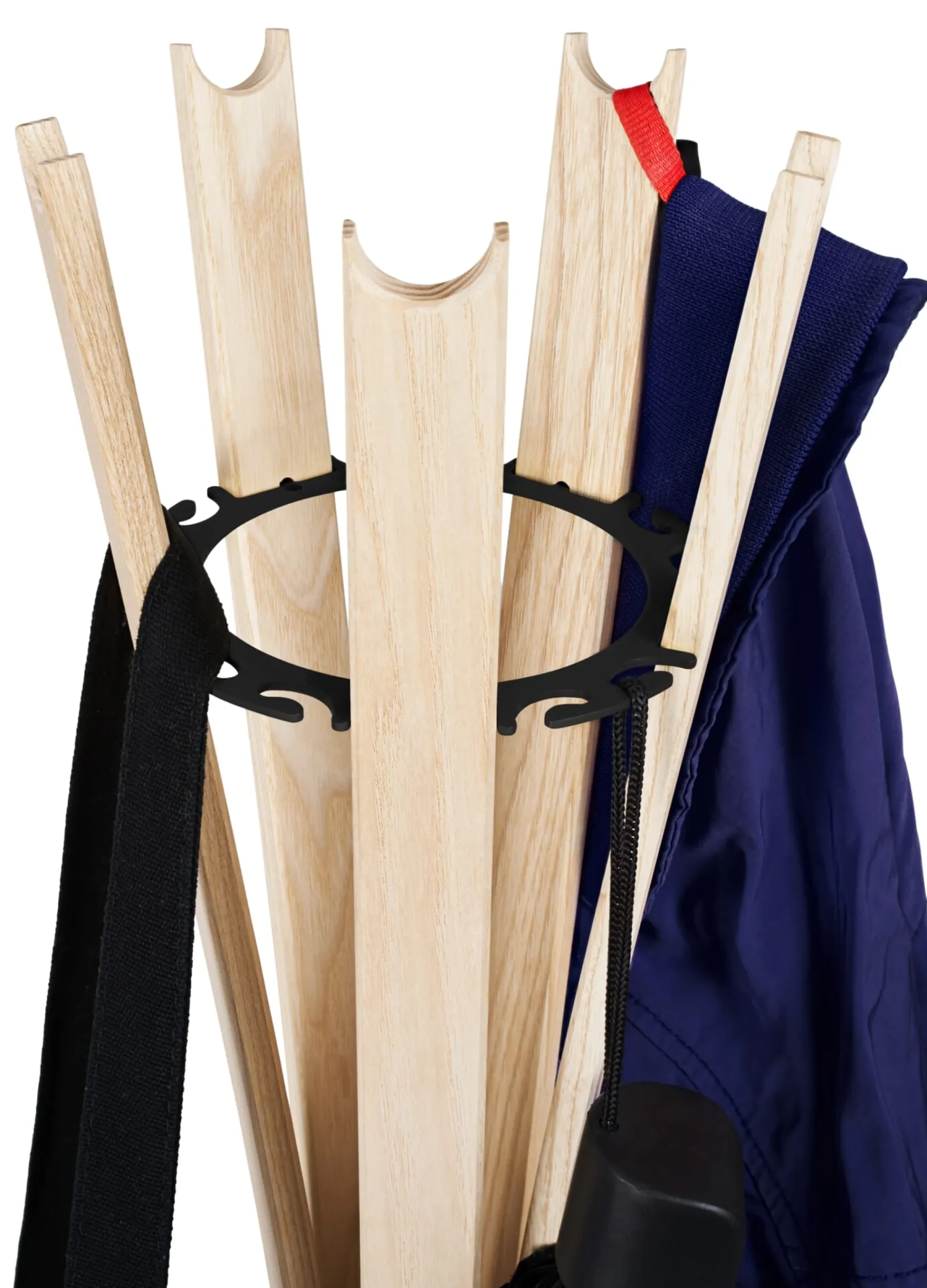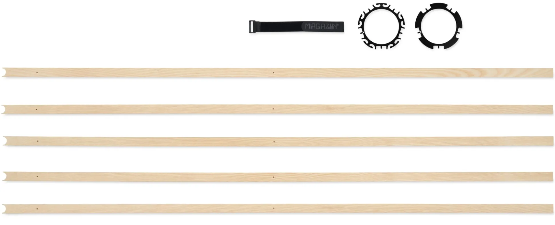 Gespannt wie ein Flitzebogen: BENGEL heißt die kleine Garderobe, deren Konstruktionsprinzip gleichermaßen verblüffend einfach, selbstreferenziell nachvollziehbar und höchst wirkungsvoll ist. Fünf Leisten aus Eschenholz werden über zwei Stahlringe und einen Spanngurt aus Klettband auf Spannung gebracht und sorgen für eine einzigartige Standfestigkeit auf kleinem Raum. Die zierliche formschöne Garderobe ist schnell und werkzeugfrei aufzubauen und lässt sich trotz ihres geringen Volumens und ihrer Leichtigkeit richtig vollpacken und als Garderobe im Büro oder in der Wohnung nutzen.