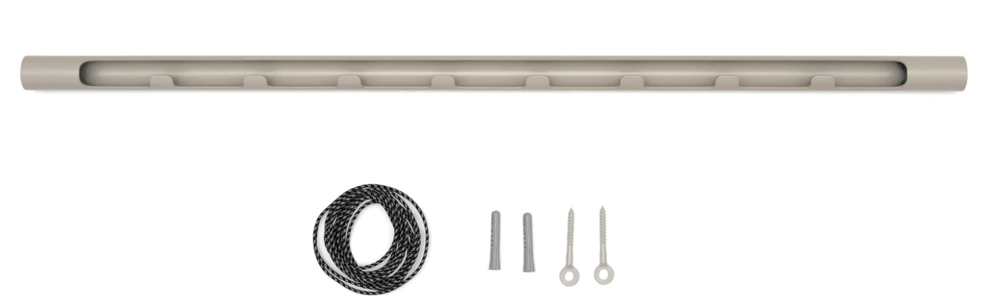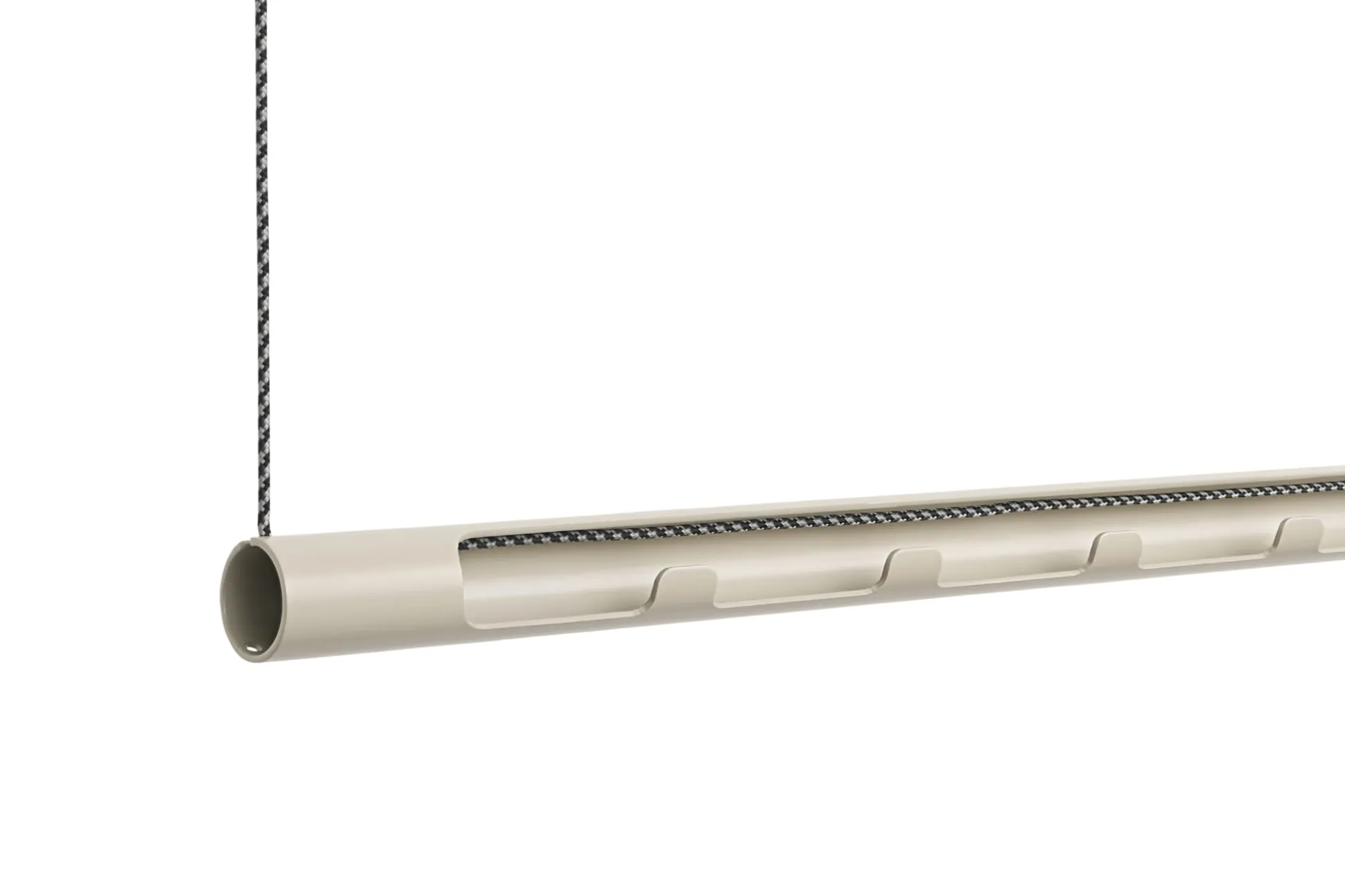 Platz-sparend und Raum-schaffend: KARLA ist eine frei von der Decke pendelnde Garderobenstange. Sie lässt sich mit Kleiderbügeln jeder Art bestücken. Der besondere Clou: Das Rohr ist teilweise eingeschnitten und weist an dieser Öffnung Haken auf, die unabhängig von der üblichen Bestückung mit Bügeln separat genutzt werden können. Das zweifarbig grau-schwarz gewirkte Seil ermöglicht eine Abhängehöhe von bis zu etwa 200 cm von der Decke. Ein schönes zusätzliches Detail sind die Ösenschrauben zur Deckenbefestigung, die ebenfalls in der jeweiligen Farbe der Stange lackiert sind.