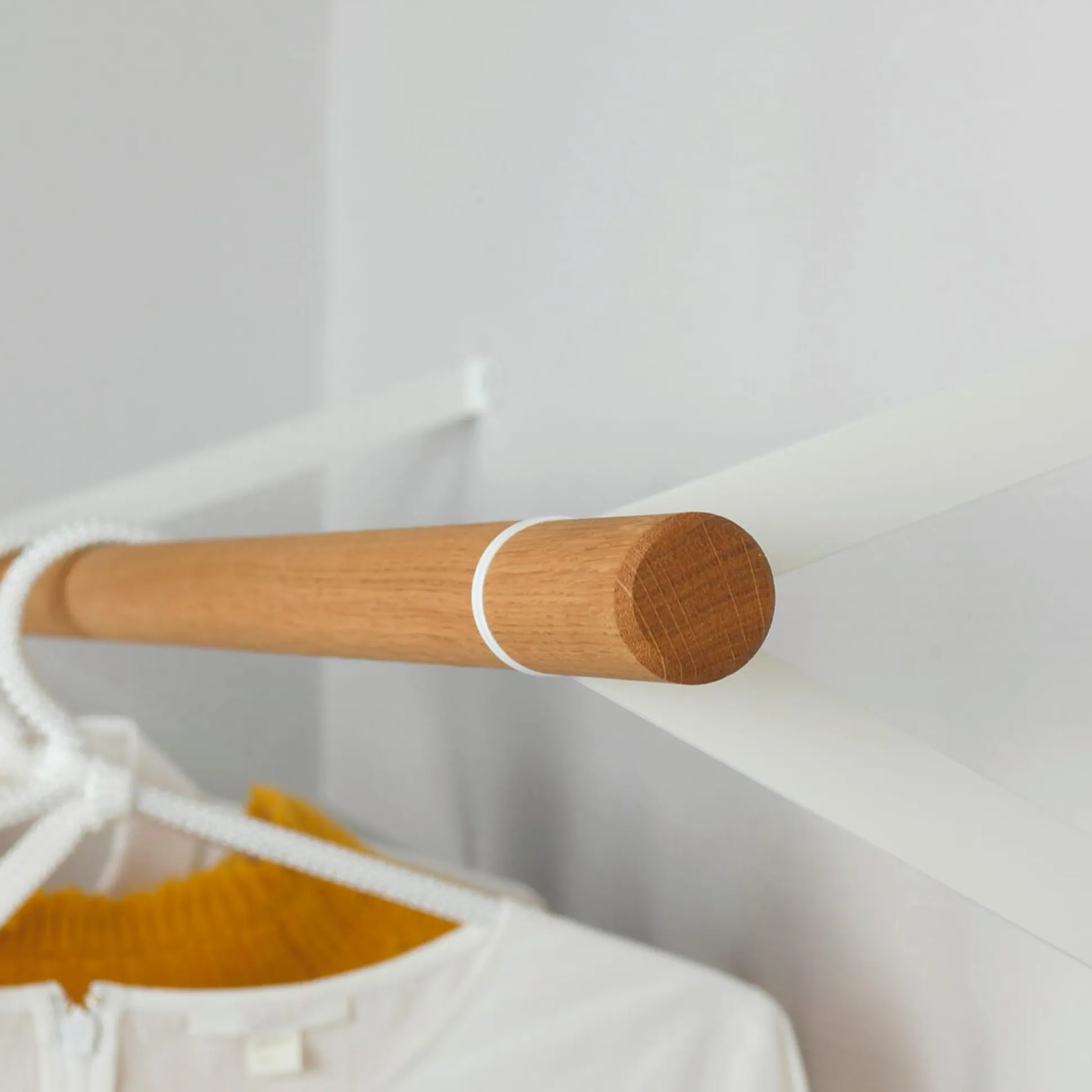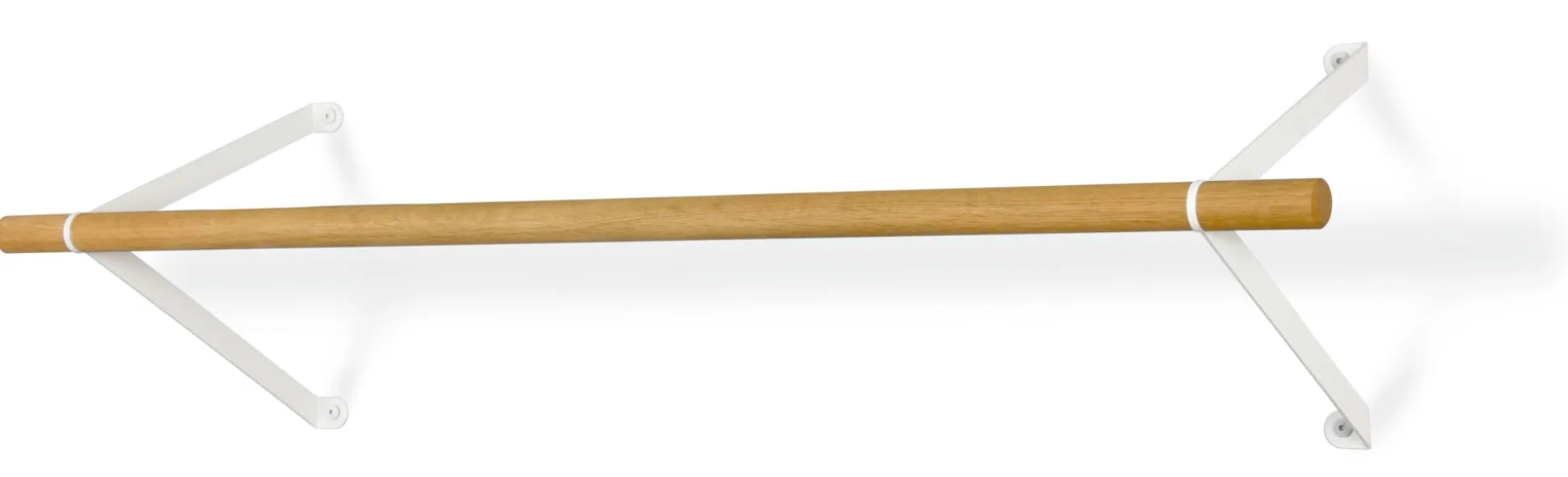 Die minimalistische Garderobe: ein fein geschliffener Holzstab, zwei stählerne Haltebügel und Schrauben. LILLI ist einfach zu montieren: Die einen Meter lange Holzstange wird durch einen Klemmmechanismus fest in ihrer Position gehalten. Die Garderobe ist belastbar, stabil und hält mühelos einen Meter Kleidung. Durch den vorgegebenen Abstand zur Wand lassen sich fast alle Typen an Kleiderbügeln gerade einhängen.