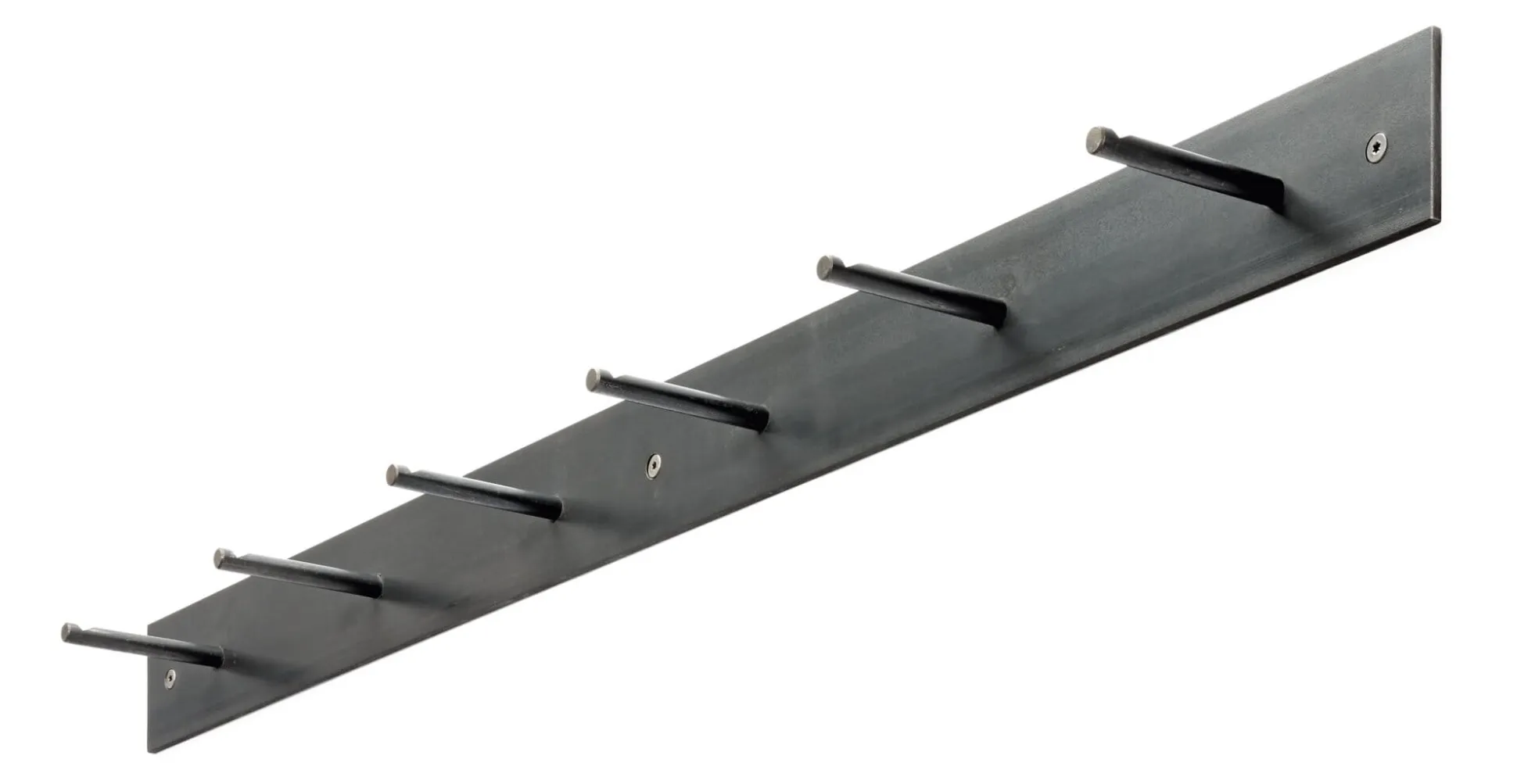 Reduzierter und gleichzeitig funktionaler geht es kaum. Diese Garderobenleiste besteht aus einem Stück Flachstahl und sechs gekerbten Rundeisen als Haken. Sie sind so angebracht, dass auch bei der Montage von zwei oder mehr dieser Garderoben nebeneinander die Abstände der Haken immer gleich sind. Das Material ist nicht rostfrei, der Rohstahl ist jedoch geölt. Rost ist somit außerhalb von Feuchträumen kein Problem. Aus Deutschland.