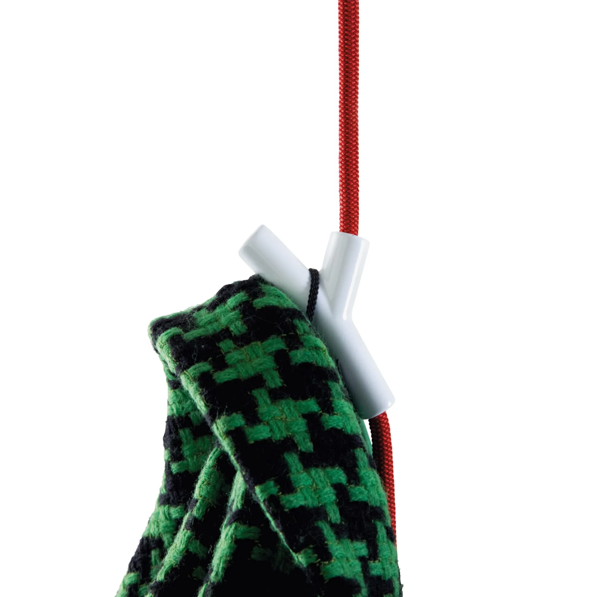 WARDROPE wird an die Decke gehängt! Das Seil mit textiler Oberfläche und einem stählernen Gewicht an seinem Ende trägt leicht verschiebbare Haken aus Zinkdruckguss. Diese blockieren bei Belastung, und so sind Sakko und Mantel im Flur sowie Handtücher im Bad platzsparend versorgt.