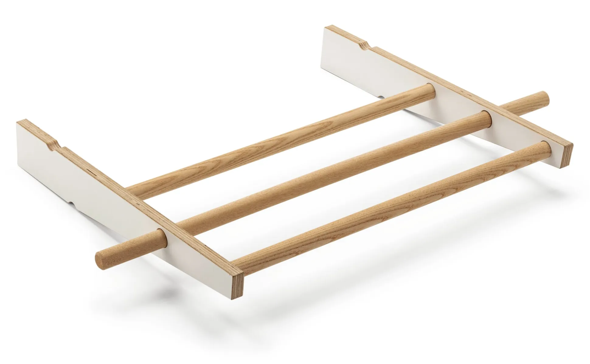 Material: Birke Multiplex (Herkunft: Osteuropa) 15 mm, beidseitig weiß melaminharzbeschichtet, Stäbe: Eschenholz (Herkunft: Osteuropa)