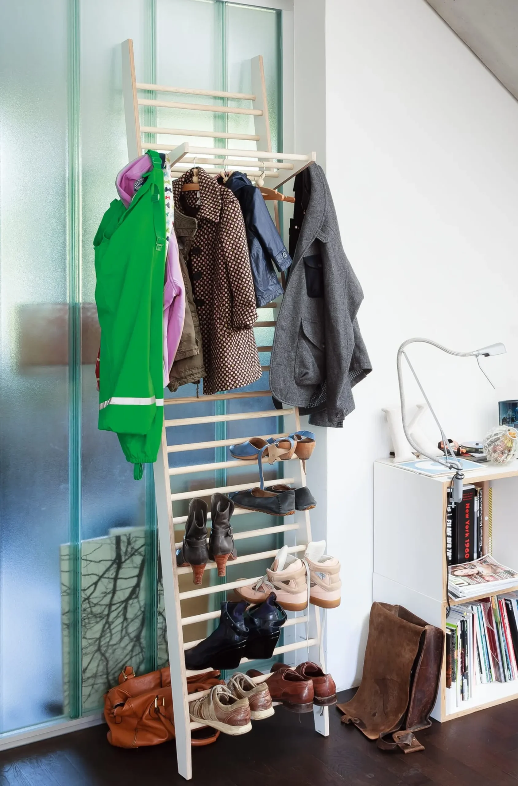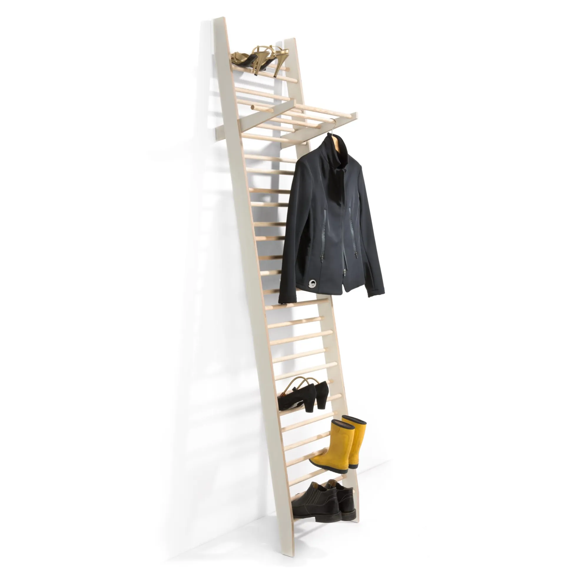 Das ergänzende Garderobenelement zum Schuhregal PLATZWART macht das Möbel zur kompletten Garderobe. Die Konstruktion ist in der Höhe flexibel und werkzeugfrei einsetzbar.