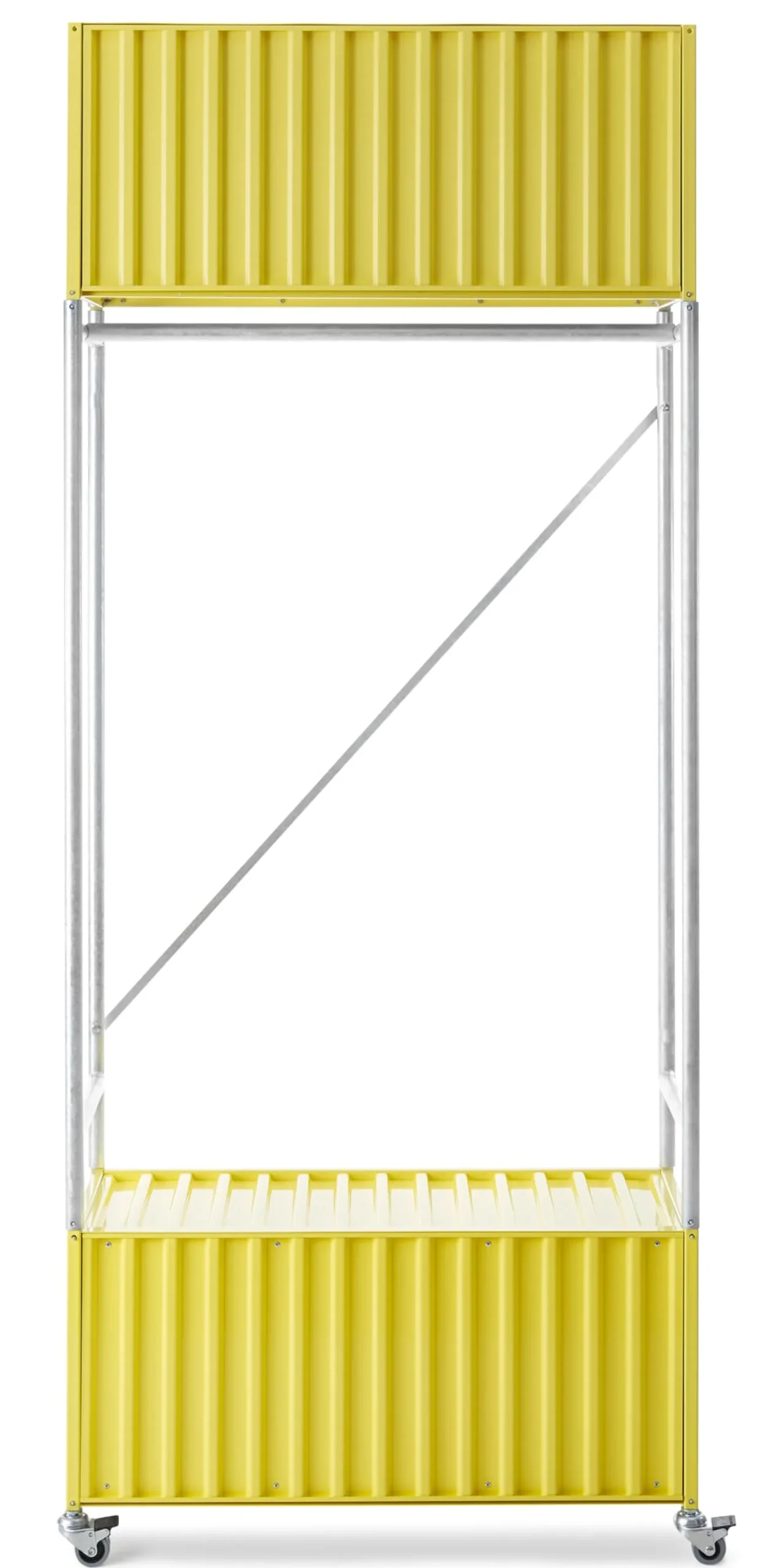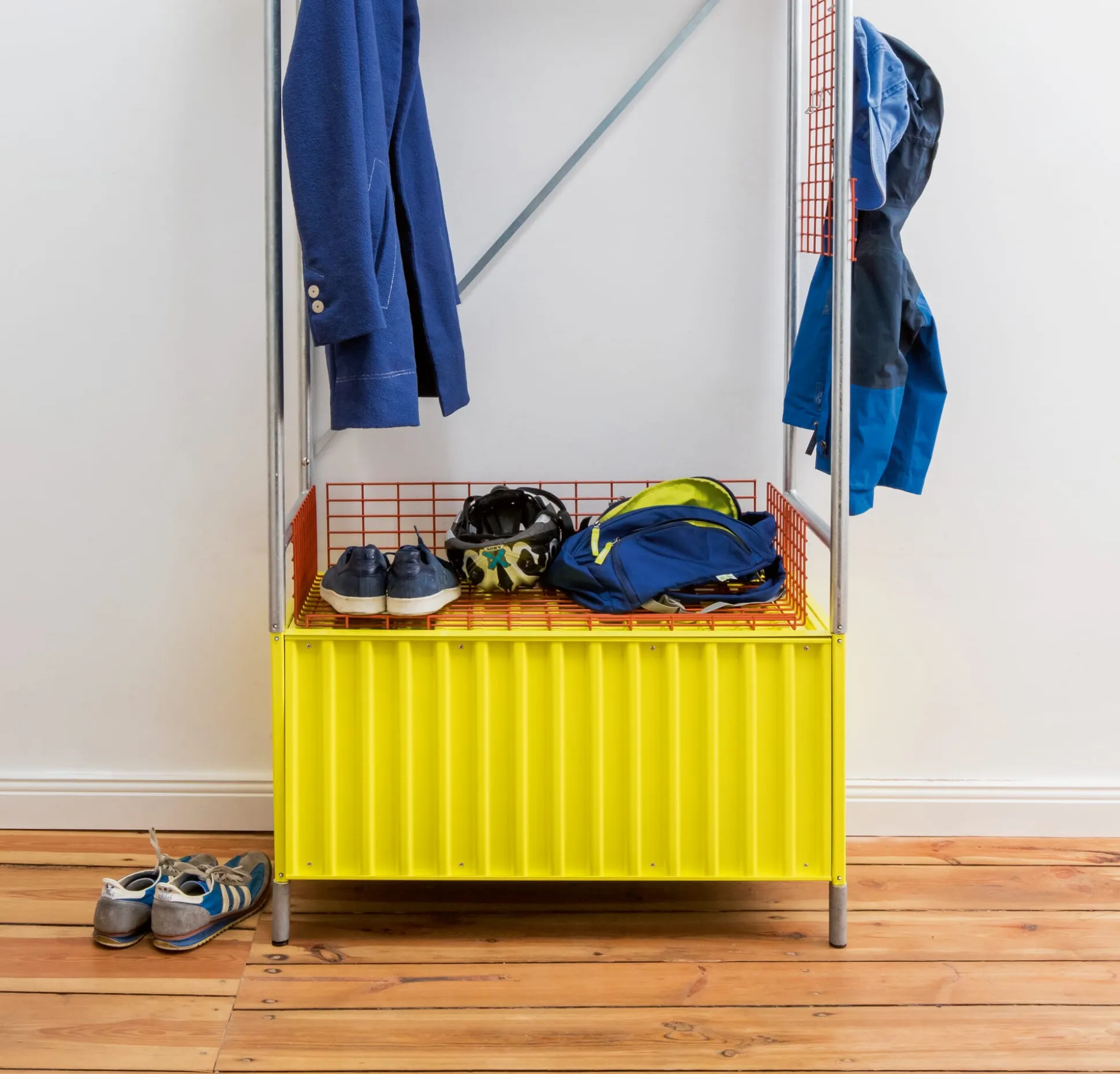 Das Garderobengestell selbst besteht aus vier Teilen und lässt sich mit wenig Aufwand montieren. Die Befestigung zwischen dem Garderobenelement und den Containern bzw. dem Regalelement erfolgt über die beiliegenden Verbinder. Das Produkt besitzt eine feuerverzinkte Oberfläche. Die robuste und industrielle Qualität ist Merkmal dieser Art der Oberflächenveredelung. Sie ist bewusst gewählt und steht im spannungsvollen Kontrast zu den lackierten Flächen der Container.
