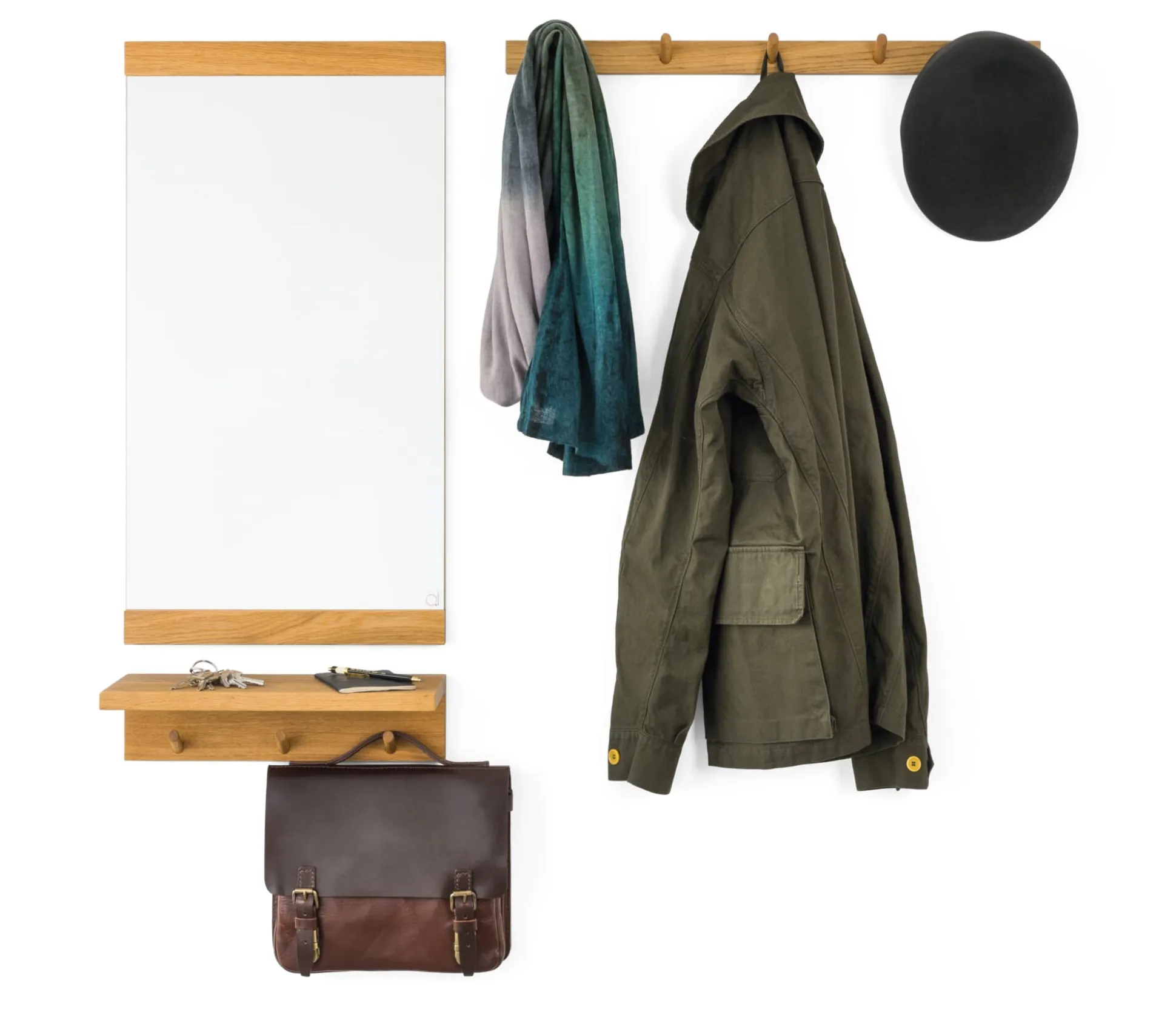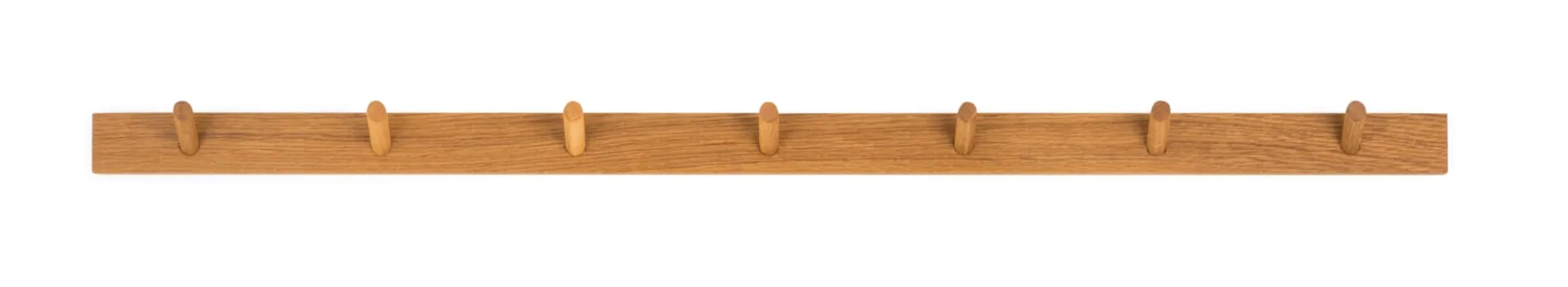 Die Garderobenleisten dieser Garderobenserie aus geöltem Eichenholz sind miteinander kombinierbar: Bündig montiert, bleibt ihre Symmetrie erhalten – denn die Zwischenräume zwischen den Haken sind doppelt so groß wie der Abstand von der Außenkante zum Haken.