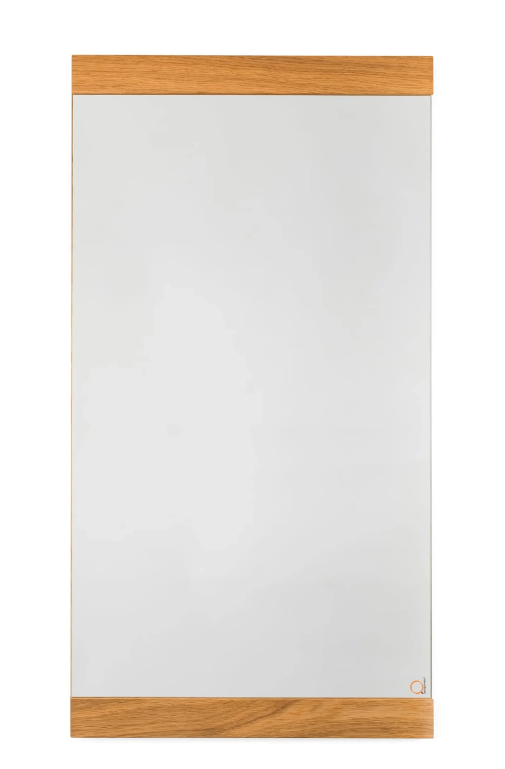 Spiegelglas, Leisten aus geöltem Eichenholz (Herkunft Deutschland). Rückseitig mit zwei Schlüsselloch-Aufhängern aus Metall. Höhe 70,5 cm, Breite 37,5 cm, Tiefe 2 cm. Gewicht 2,6 kg. Schrauben und Dübel liegen bei.