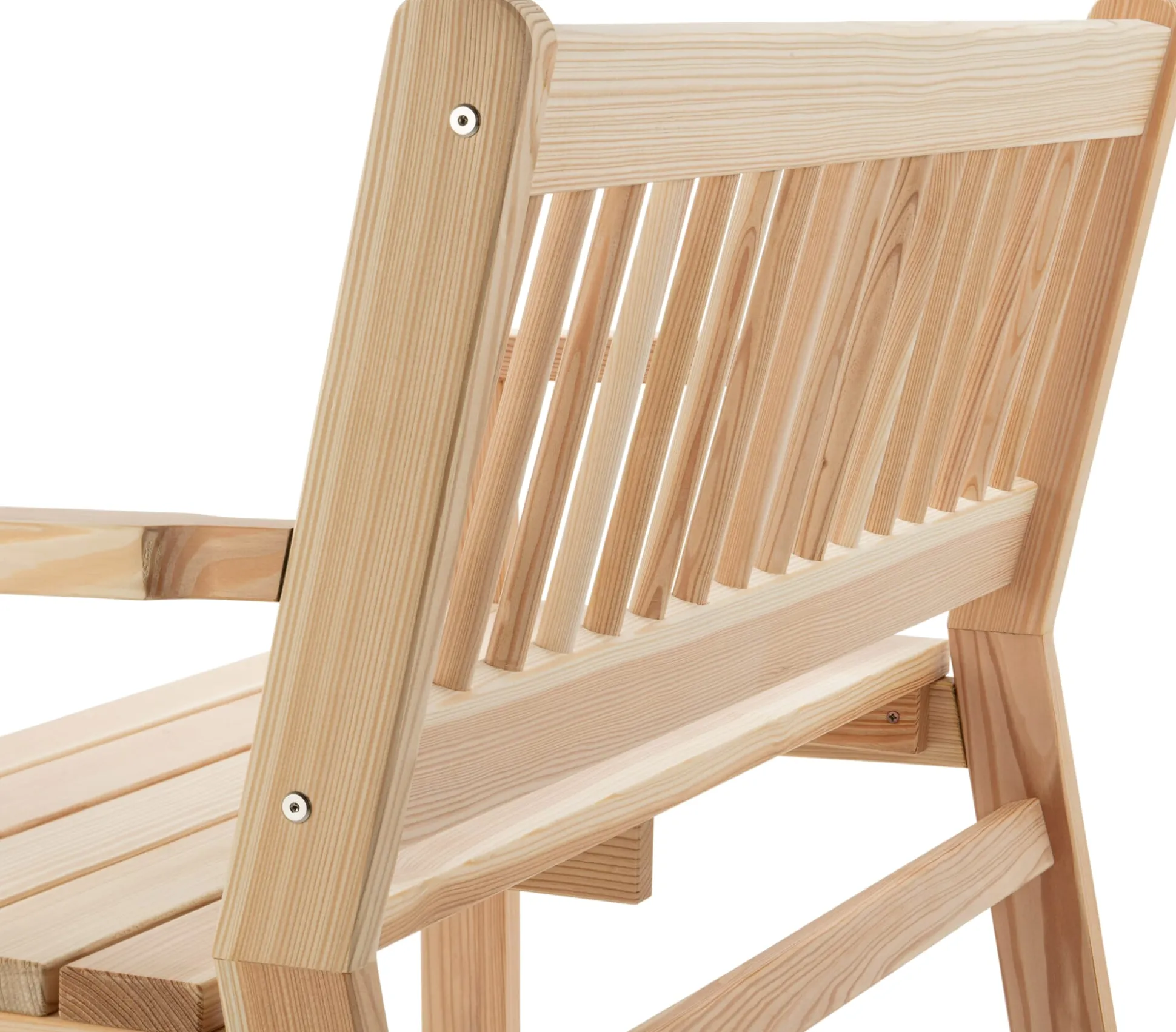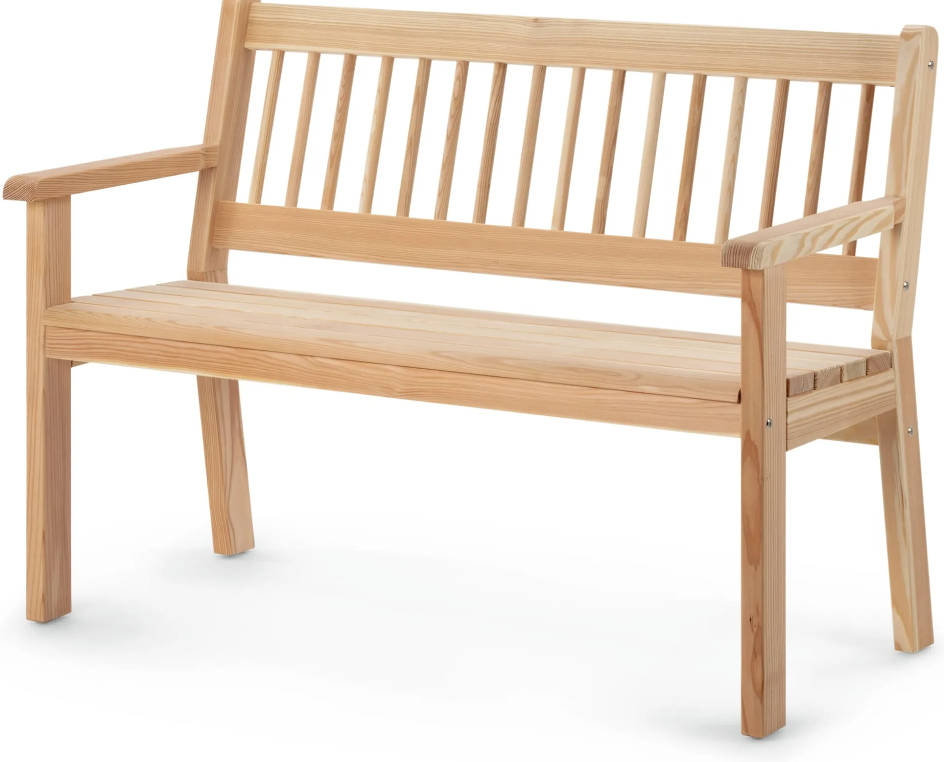 Lärchenholz unbehandelt (Herkunft Deutschland). Kunststoffschoner zum Schutz des Untergrundes. Breite der Armlehnen 6 cm. Sitzbreite 119 cm. Sitzhöhe 47 cm, Sitztiefe 40,5 cm. Breite 122 cm, Tiefe 60 cm, Höhe 91,5 cm. Gewicht 20 kg.