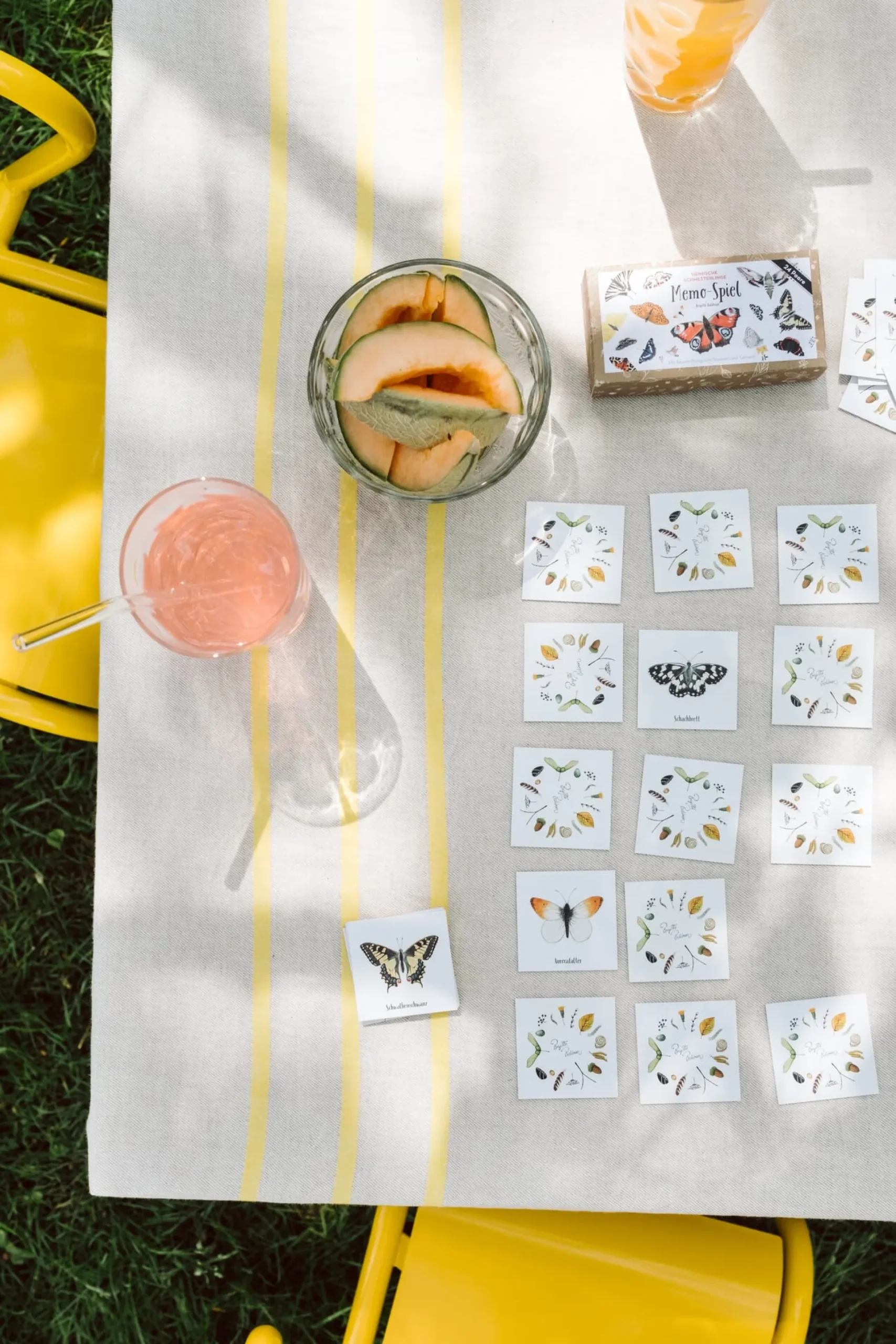 48 Spielkarten (6 × 6 cm) aus Graskarton, mit 24 farbigen Motiven. In einer Stülpschachtel aus Pappe, L 7 × B 14 × H 3 cm. Gesamtgewicht 180 g.
