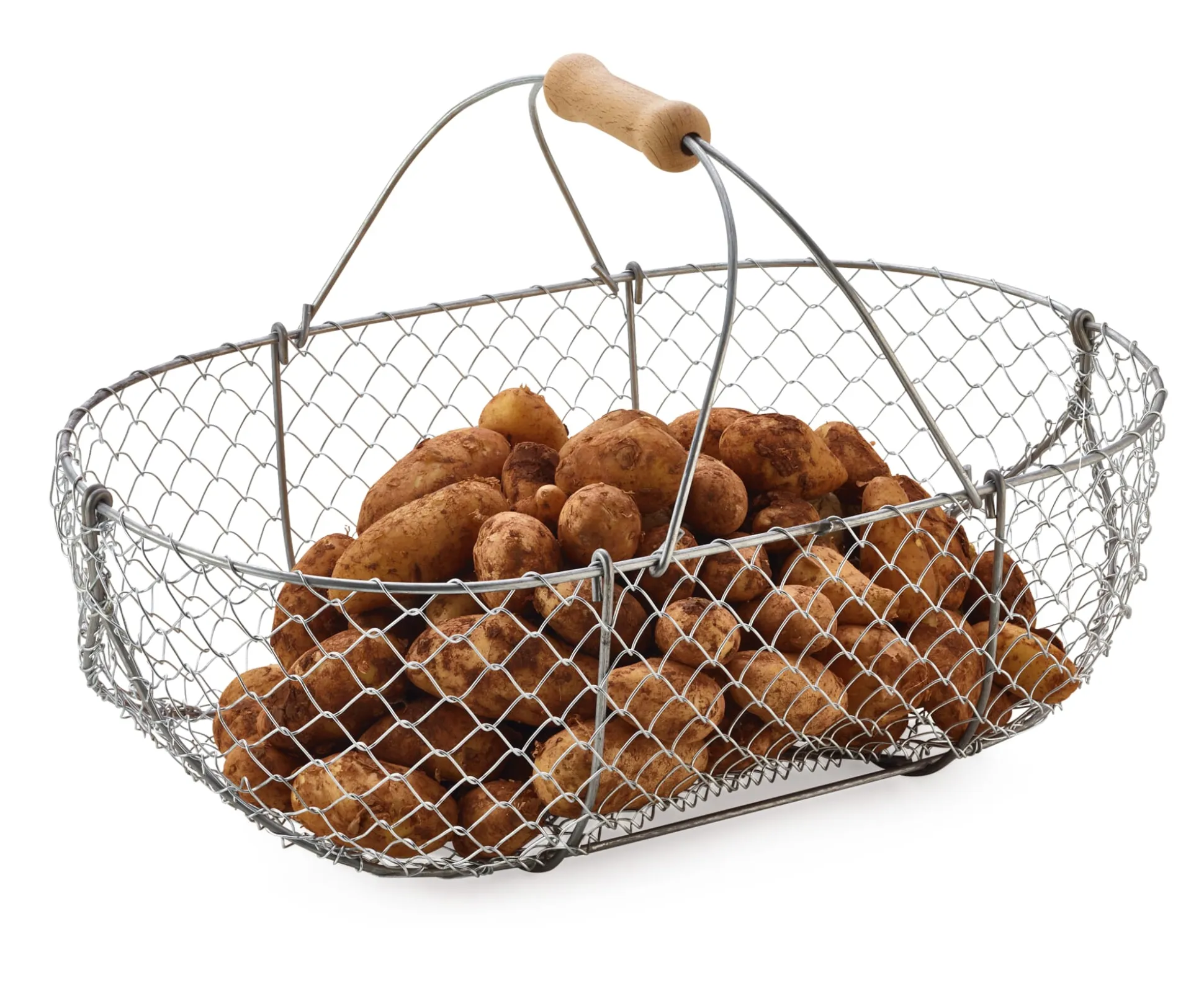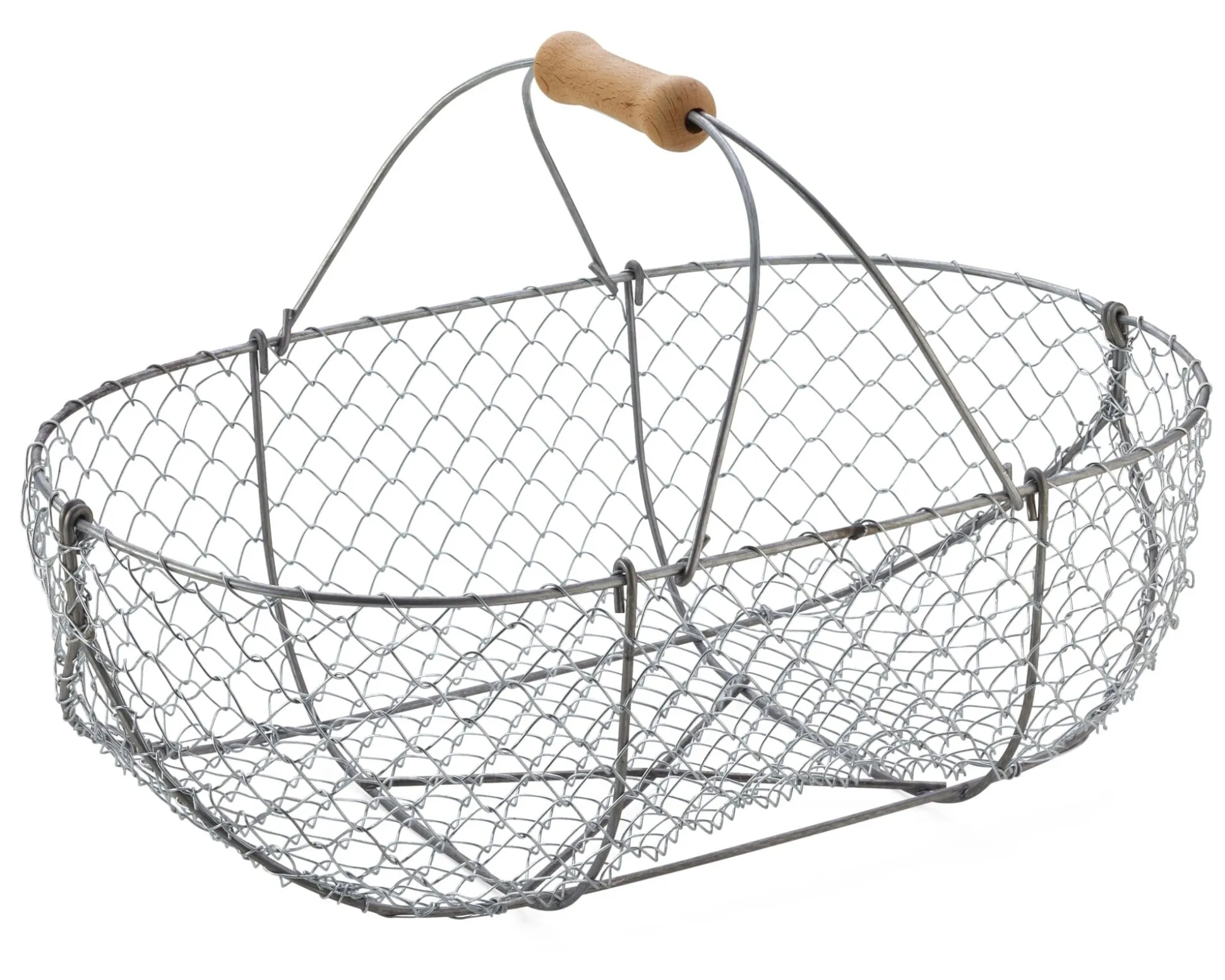 Feuerverzinktes Drahtgeflecht in einem Rahmen aus galvanisch verzinktem Draht. Henkel ebenfalls aus galvanisch verzinktem Draht, mit Buchenholzgriff. Hergestellt in Frankreich.