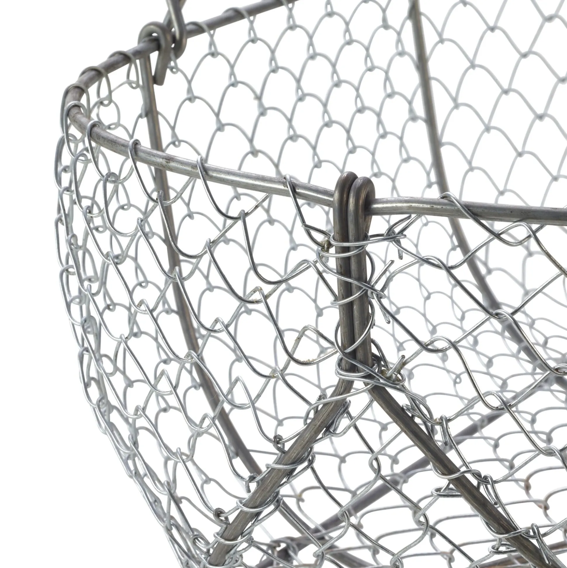 Einst einem speziellen Zweck zugedacht – bei der Ernte für den neuen Cidre im Spätsommer die Äpfel aufzunehmen –, wird dieser Korb heute noch in Frankreich gefertigt. Nicht in der Normandie allerdings, sondern in der Bretagne, wohin der herstellende Familienbetrieb vor Jahrzehnten umsiedelte und sein Repertoire von Gartenkörben um Reusen und Körbe für die Fischerei und Schalentierernte erweiterte. Das Grundmaterial bleibt immer gleich: ein Geflecht aus belastbarem Draht, das aufwendig in ein stabiles Gerüst aus einem noch stärkeren Draht gespannt wird. Auf diese Weise entsteht ein sehr haltbares, dauerhaft unempfindliches Behältnis für die verschiedensten Zwecke. Der Handgriff ist aus Buchenholz gefertigt.