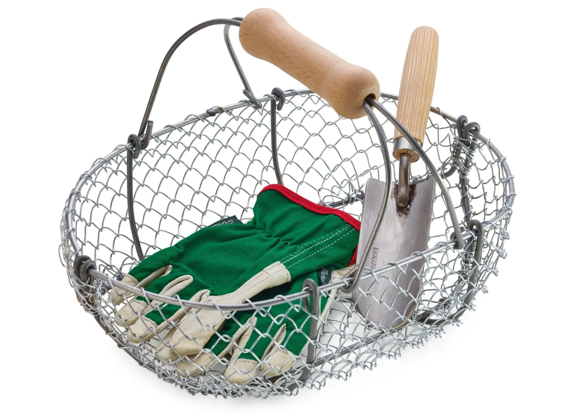 Einst einem speziellen Zweck zugedacht – bei der Ernte für den neuen Cidre im Spätsommer die Äpfel aufzunehmen –, wird dieser Korb heute noch in Frankreich gefertigt. Nicht in der Normandie allerdings, sondern in der Bretagne, wohin der herstellende Familienbetrieb vor Jahrzehnten umsiedelte und sein Repertoire von Gartenkörben um Reusen und Körbe für die Fischerei und Schalentierernte erweiterte. Das Grundmaterial bleibt immer gleich: ein Geflecht aus belastbarem Draht, das aufwendig in ein stabiles Gerüst aus einem noch stärkeren Draht gespannt wird. Auf diese Weise entsteht ein sehr haltbares, dauerhaft unempfindliches Behältnis für die verschiedensten Zwecke. Der Handgriff ist aus Buchenholz gefertigt.