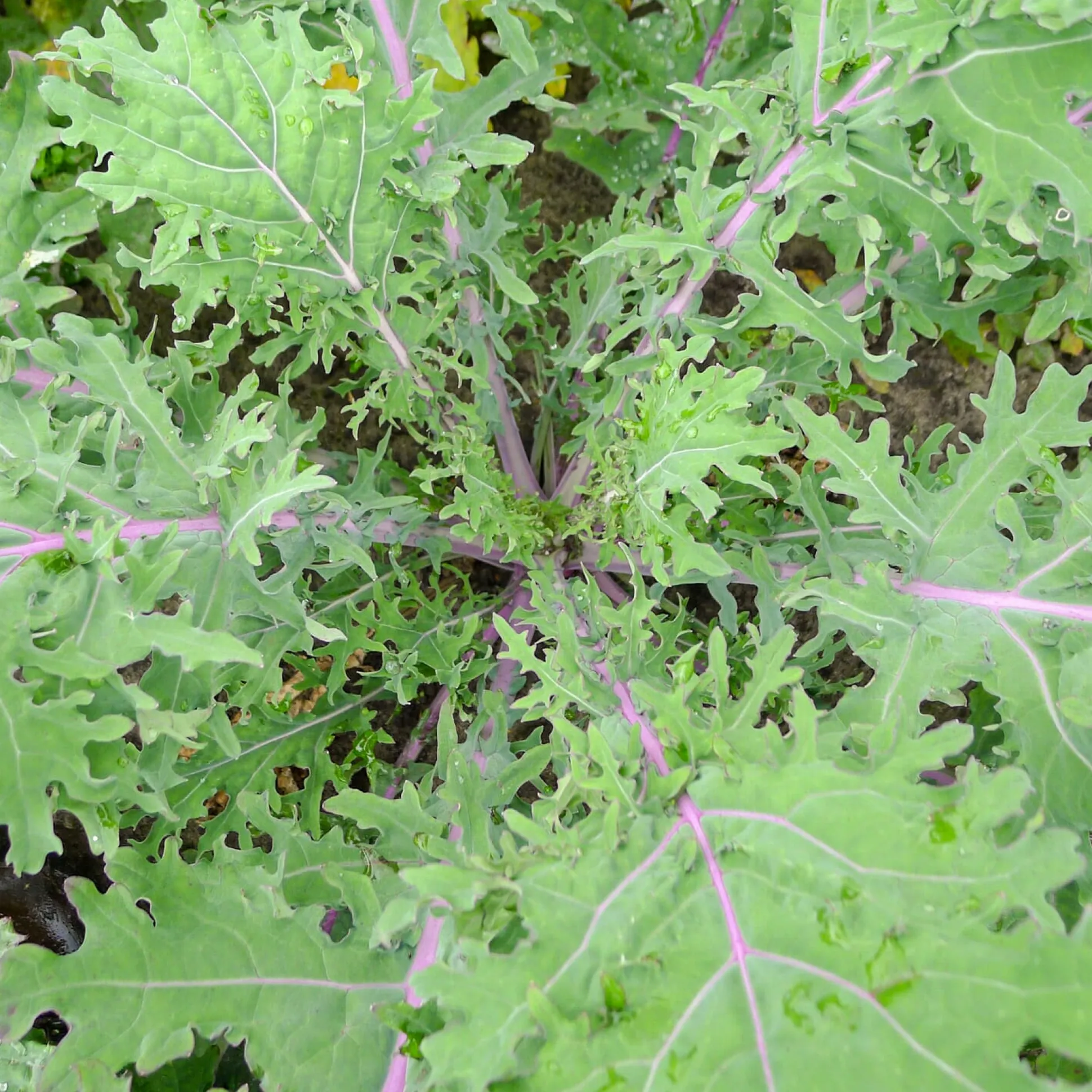 Gesunder, wüchsiger Blattkohl mit violetten Stielen und dunkelgrünen, gezackten Blättern, die deutlich weicher sind als bei Grünkohl und von mildaromatischem Geschmack. Ab August können die jungen Blätter fortlaufend geerntet werden: für Salate, Bowls und Pfannengerichte. Mittlere Frosthärte.