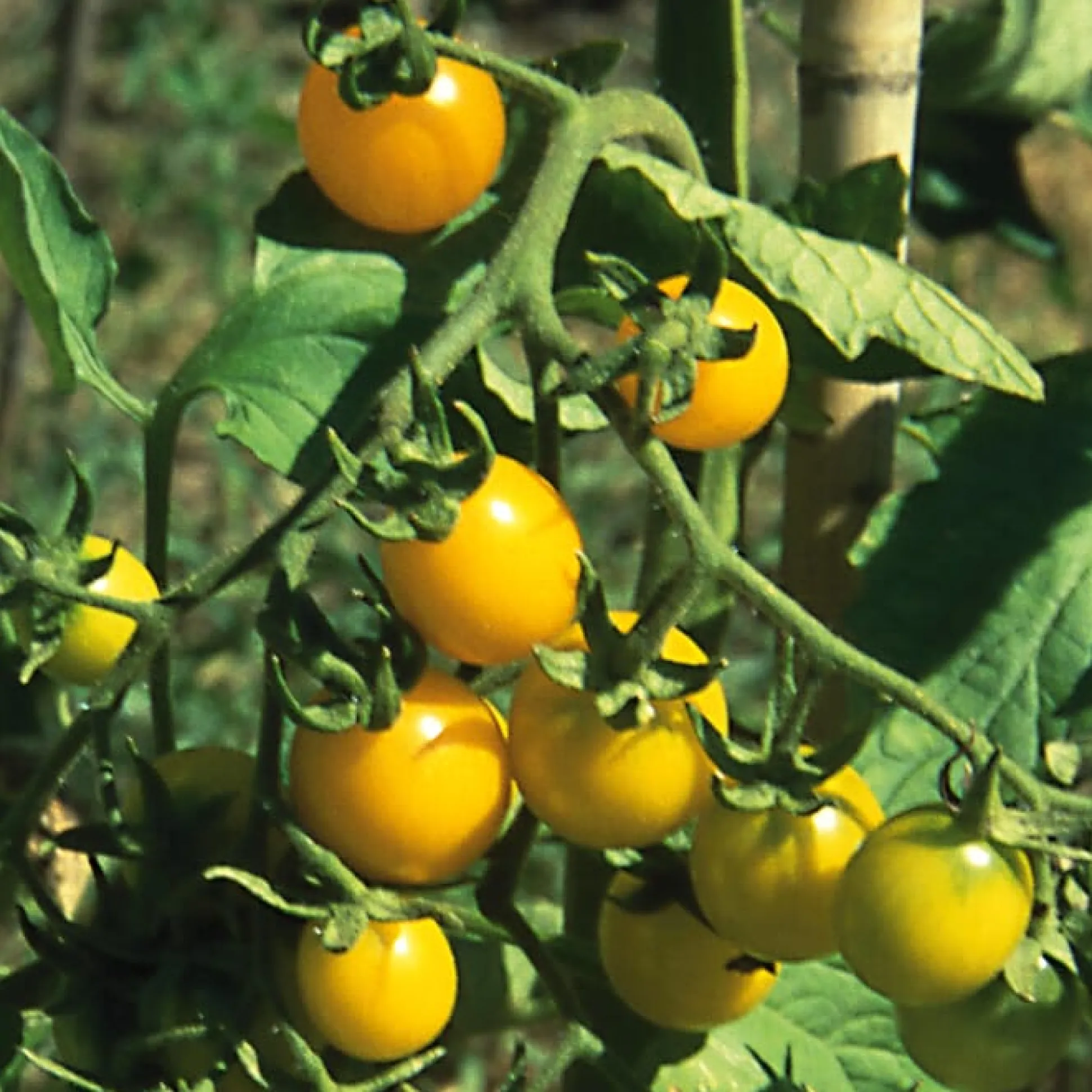 Diese Johannisbeertomate ist eine empfehlenswerte Wildform von bestem Geschmack und hervorragender Widerstandsfähigkeit gegen Braunfäule. Die kleinen, runden, gelben Tomätchen wiegen nur 6 g, sind saftig-süß und damit eine ideale Naschfrucht mit sehr langer Erntezeit. Schon Ende Juni sind die ersten Tomaten reif; die Ernte erstreckt sich dann bis in den Oktober. Ist es im September und Oktober noch warm und frostfrei, kommt es sogar zu einem regelrechten Wachstumsschub: Die im Frühsommer einfachen Fruchttrauben, gabeln sich im Herbst und können dann den doppelten Ertrag bringen. Reife Früchte können lange hängenbleiben, ohne an Geschmack zu verlieren. Die bis 2,5 m hohen Pflanzen sind ausgesprochen gesund und widerstandsfähig gegen Braunfäule; sie vertragen Regen ebenso gut wie große Hitze. Tipp: mehrtriebig am Spalier (2 m hoch und mindestens 1 m breit) oder an mindestens drei Stäben (oder gespannten Schnüren) ziehen.