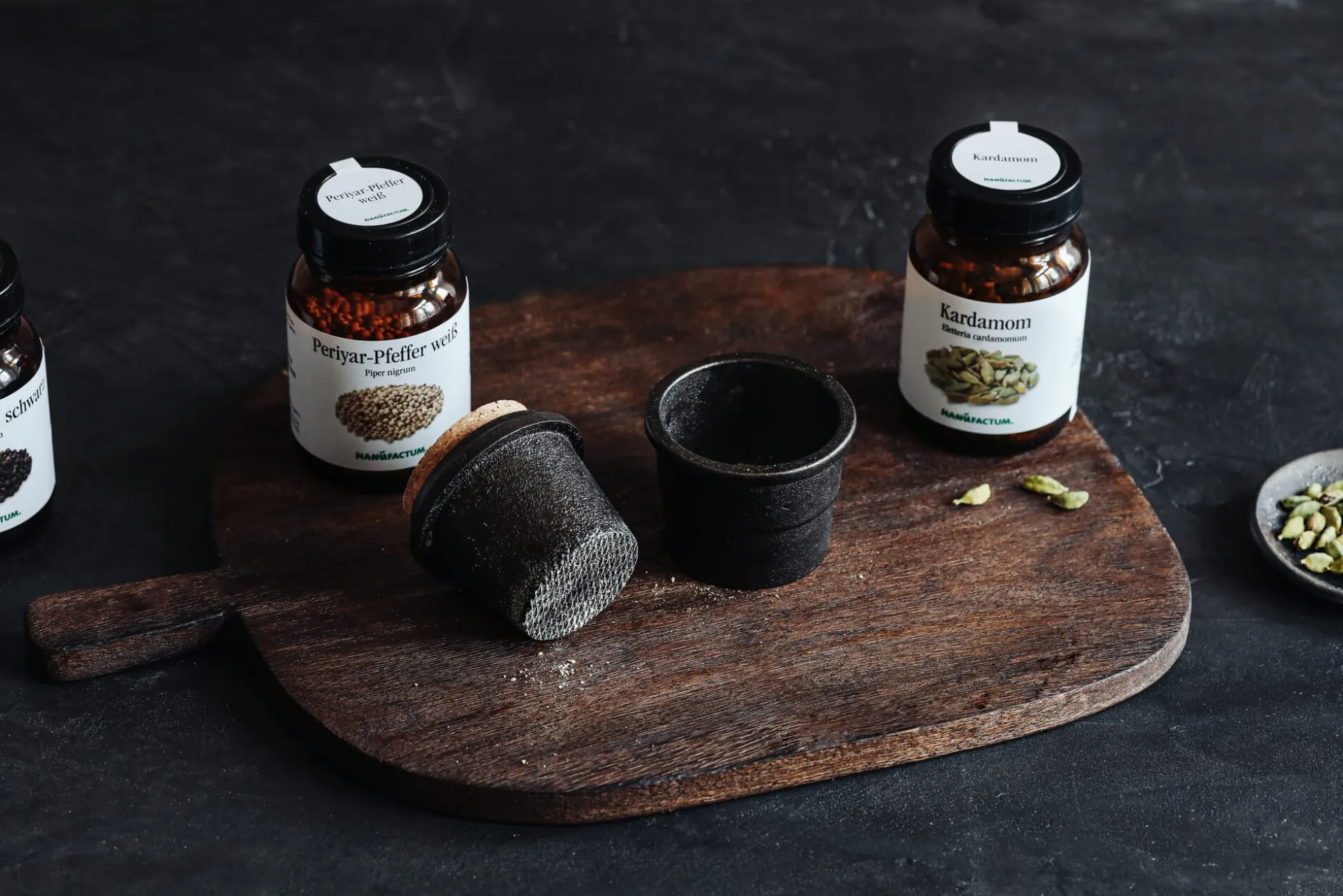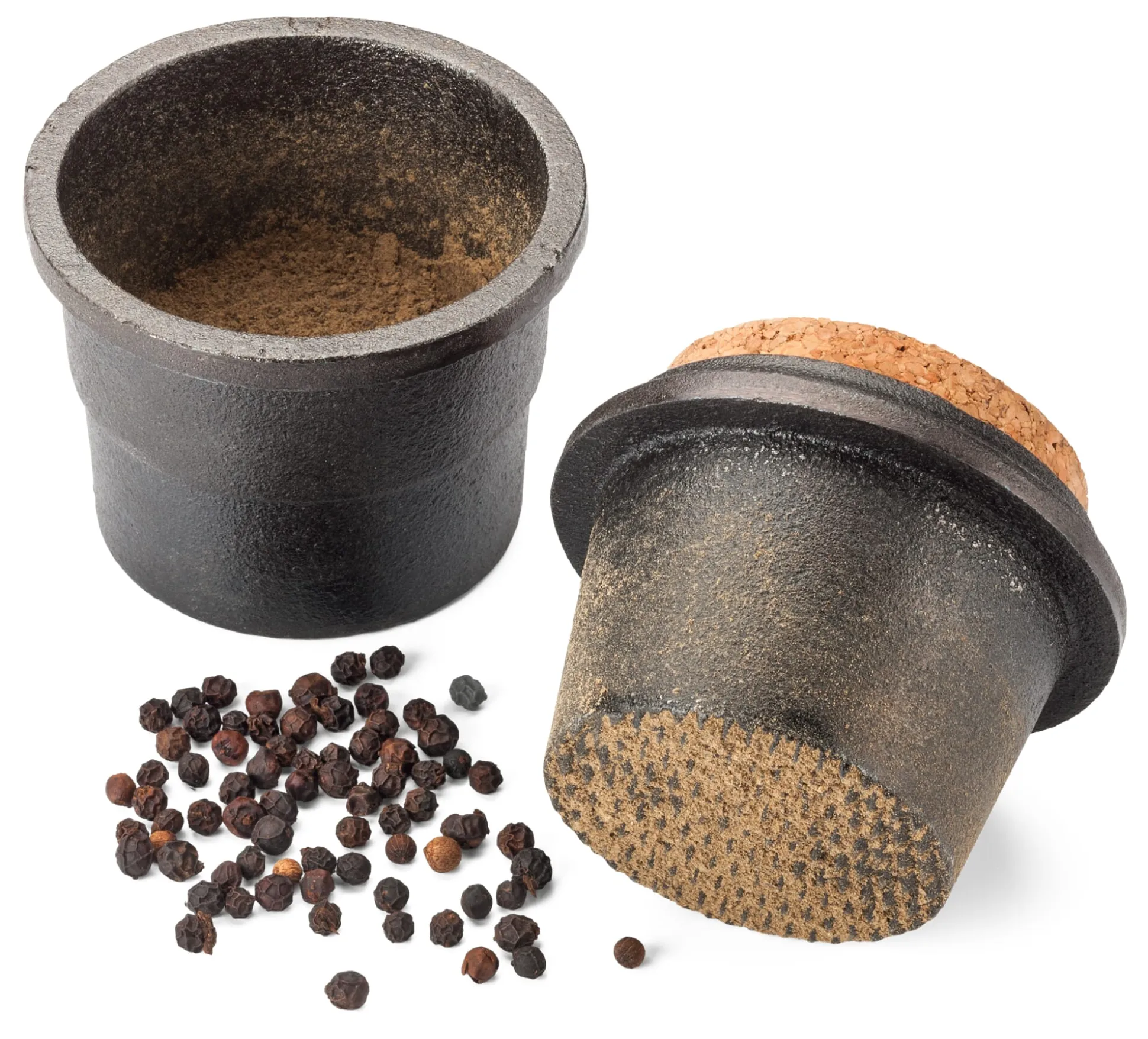 Das Gefäß nicht zu sehr füllen. Das Oberteil bietet Platz für die Gewürzaufbewahrung. Ein Korkdeckel verschließt angemessen natürlich.