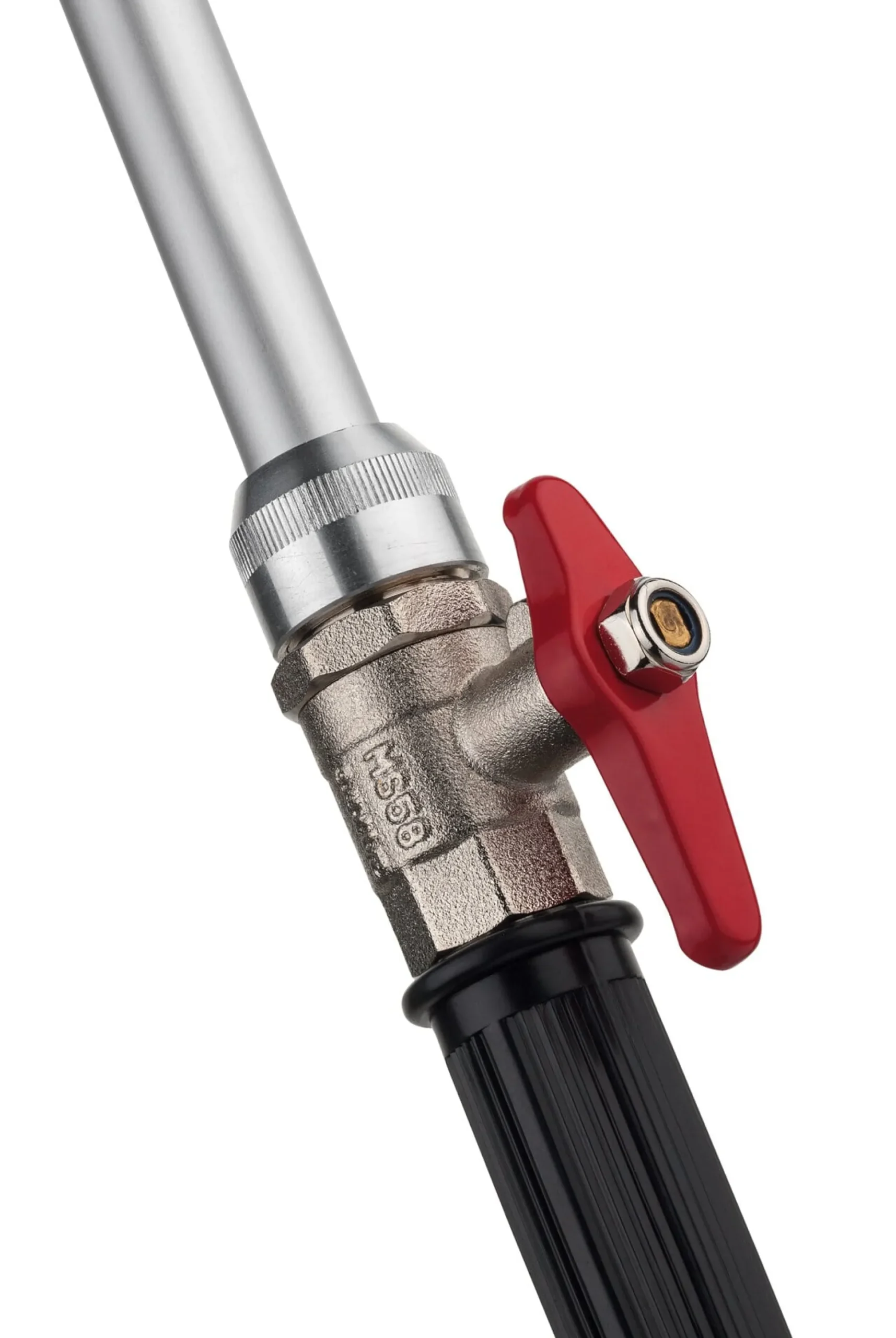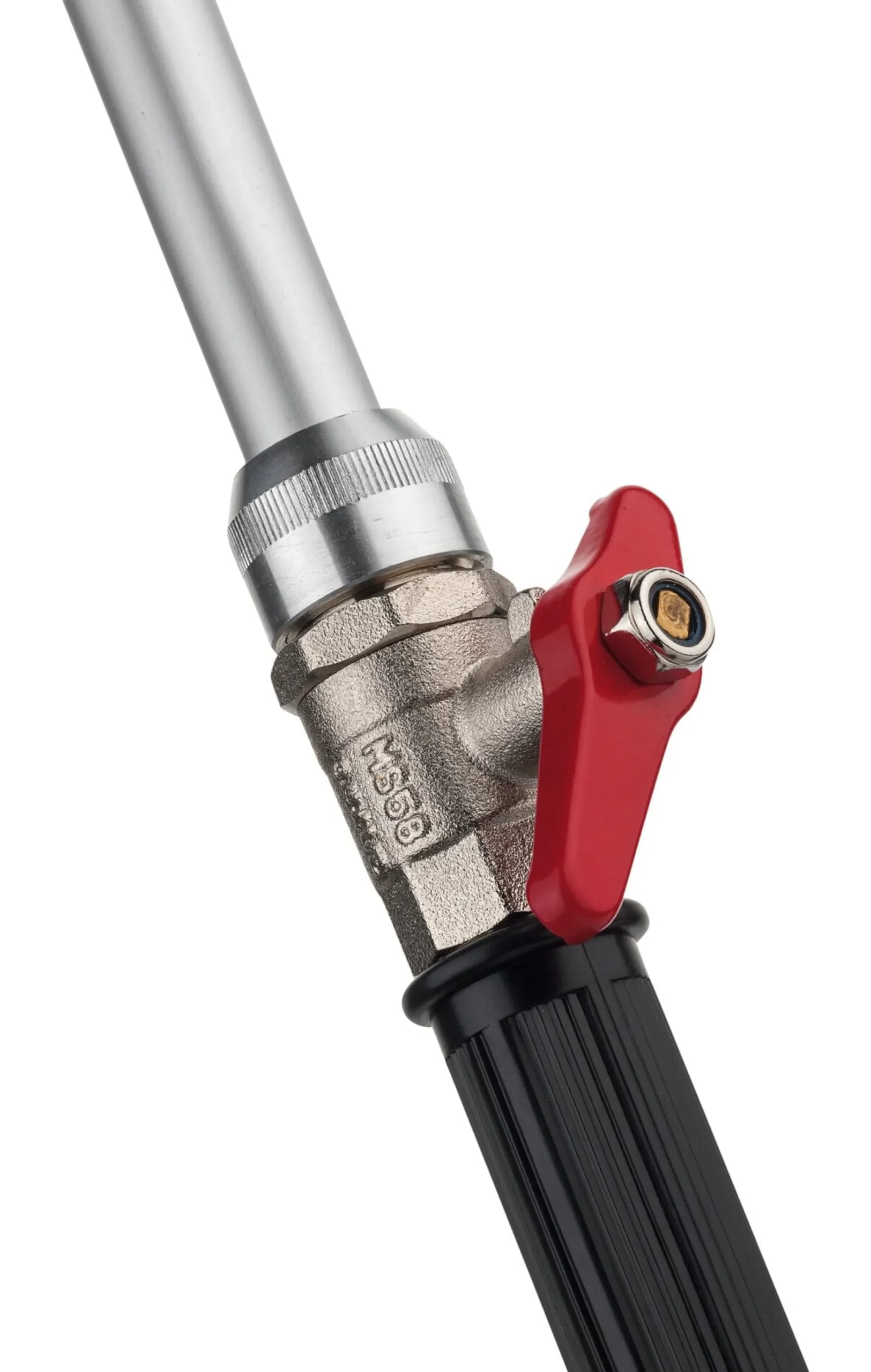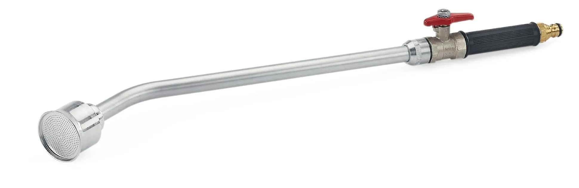In jeder Gärtnerei liegt mindestens eines dieser seit nunmehr 40 Jahren nahezu unverändert gebauten Gießgeräte. Das verwundert nicht: Es ist aus besten Materialien gemacht (Düse und Gießrohr aus Aluminium, Griff mit Gummiüberzug, Hebel aus Edelstahl, Anschlussstecker aus Messing), von geringem Gewicht für ermüdungsfreies Arbeiten, über einen Umstellhebel einfach ein- und ausschaltbar und mit einem Düsenkopf ausgestattet, der einen gleichmäßigen, durchdringenden Regen verbreitet. Über den Messingstecker kann das Vorsatzgerät direkt an einen mit einer Messing-Schlauchkupplung (oder einer gängigen Kunststoffkupplung) ausgestatteten Schlauch angeschlossen werden.