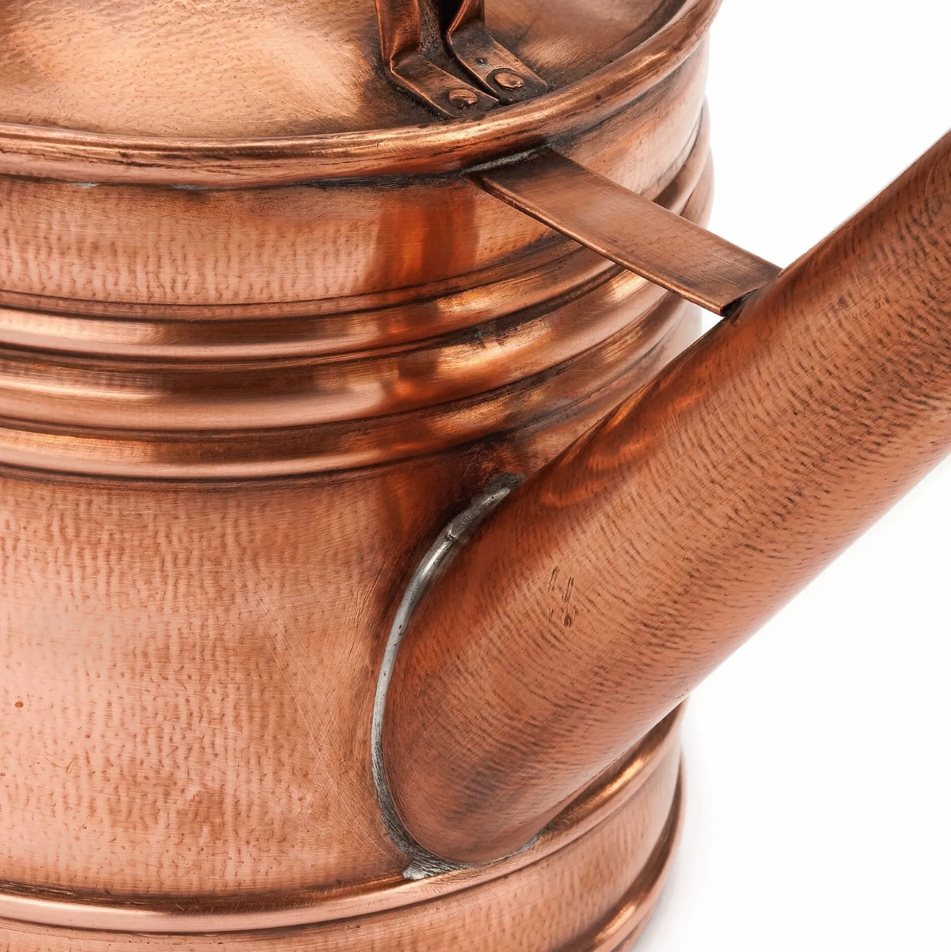 Diese Kanne kommt aus der Türkei, wo aufgrund von Rohstoffvorkommen und unter dem Einfluss des hochentwickelten arabischen Metallhandwerks die traditionellen Metallgewerke immer noch in Blüte stehen. Kupfer ist sehr stabil und bietet den Vorteil, mit der Zeit eine schützende Patina anzusetzen. Das Gießrohr ist bei dieser Kanne nahe am Boden angesetzt, was die Balance verbessert und einen geringeren Kraftaufwand beim Gießen erfordert.