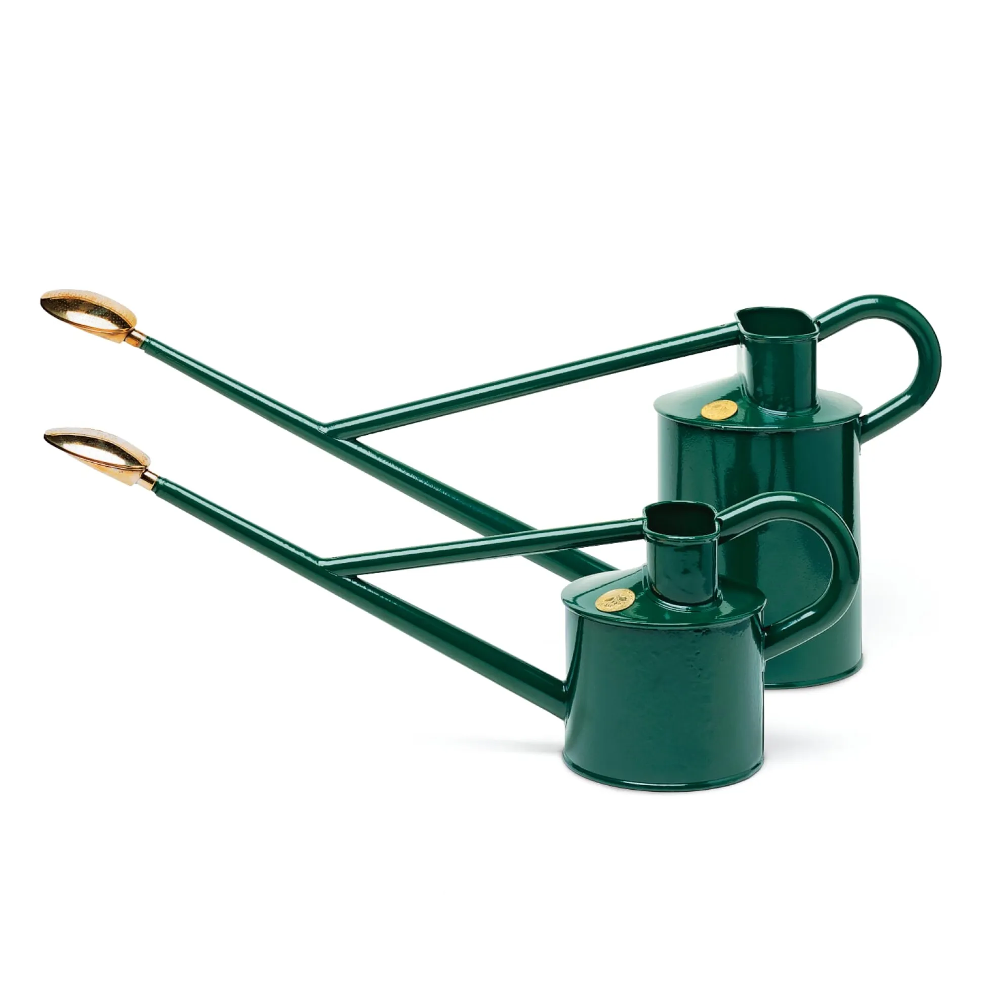 Dank ihrer speziellen Geometrie haben diese Kannen eine beeindruckende Balance und lassen sich leicht tragen. Beim Gießen verhindert der hohe Rand um die Öffnung ein Überlaufen. Aufgrund des langen Ausgusses kann die Gießtülle ohne Bücken dicht über den Boden gehalten werden, sodass die Wasserstrahlen aus den 360 (!) feinen Düsen der ovalen, aufsteckbaren Messingbrause reichlich, aber sanft herausströmen.