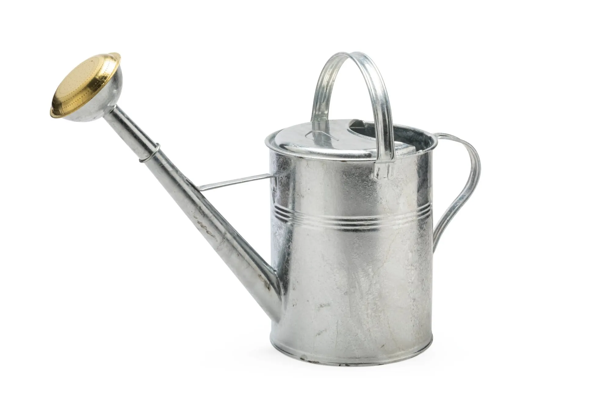 Gießkanne rund. Eine ältere Kannenform, die sogenannte englische Form – hergeleitet vom einfachen Eimer: Einer der beiden Tragegriffe läuft, gleich einem Eimerhenkel, quer über die Kanne; hinten am Kannenkörper ist zusätzlich ein weiterer, kleiner Griff angebracht. Die Kanne lässt sich also beidhändig fassen und ist damit auch dann noch sehr gut zu handhaben, wenn sie bis zum Rand gefüllt ist.