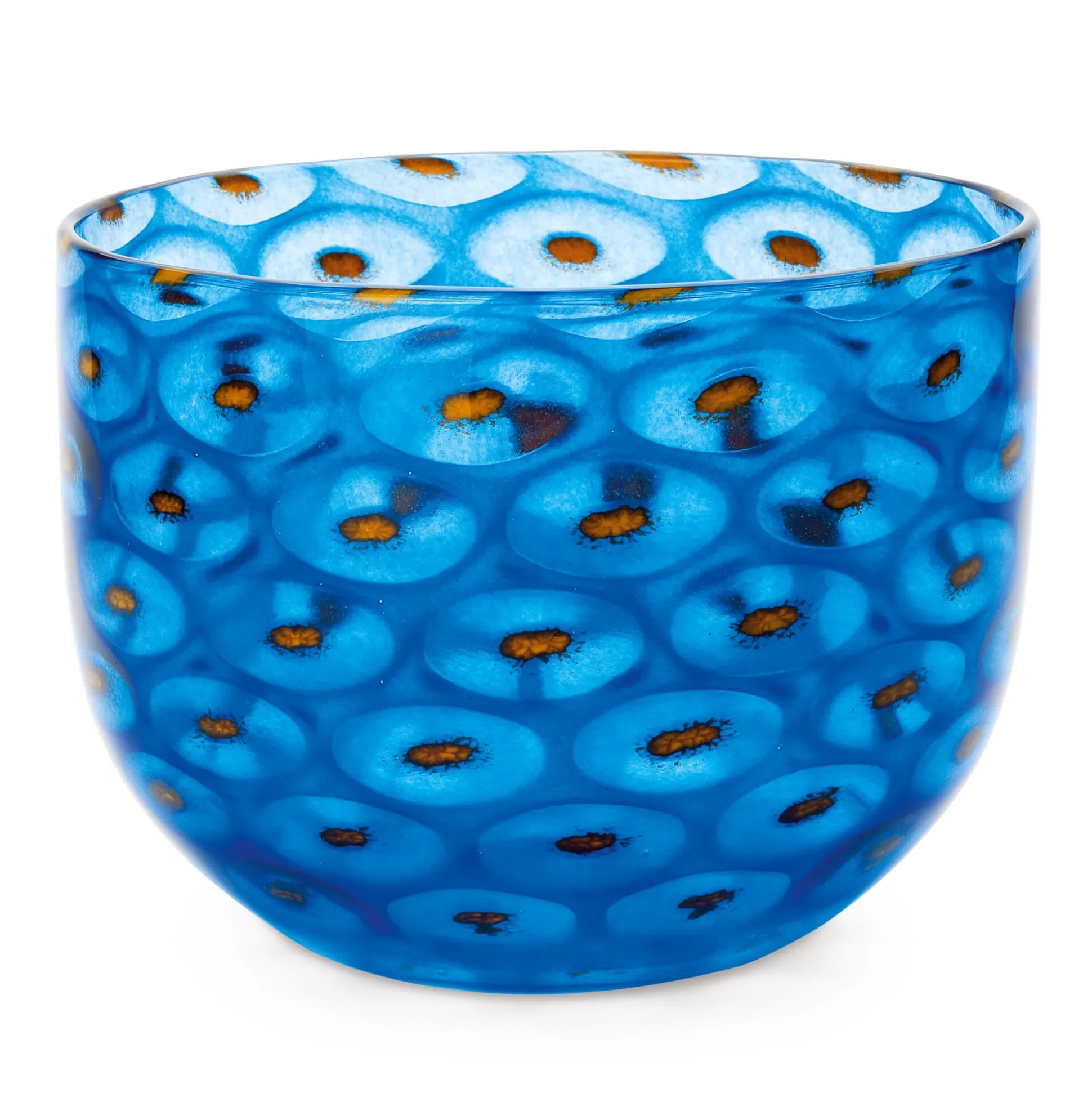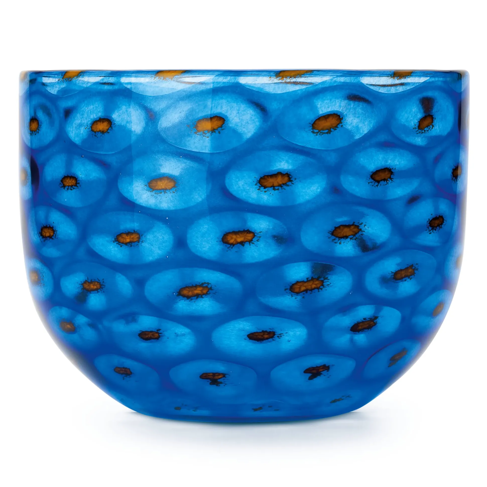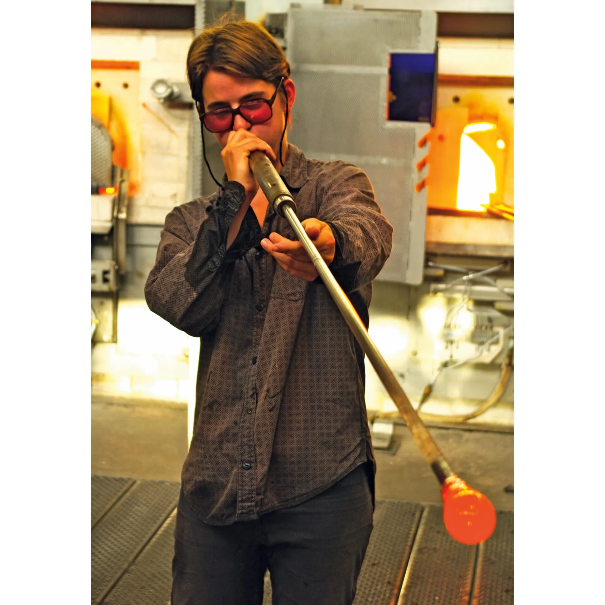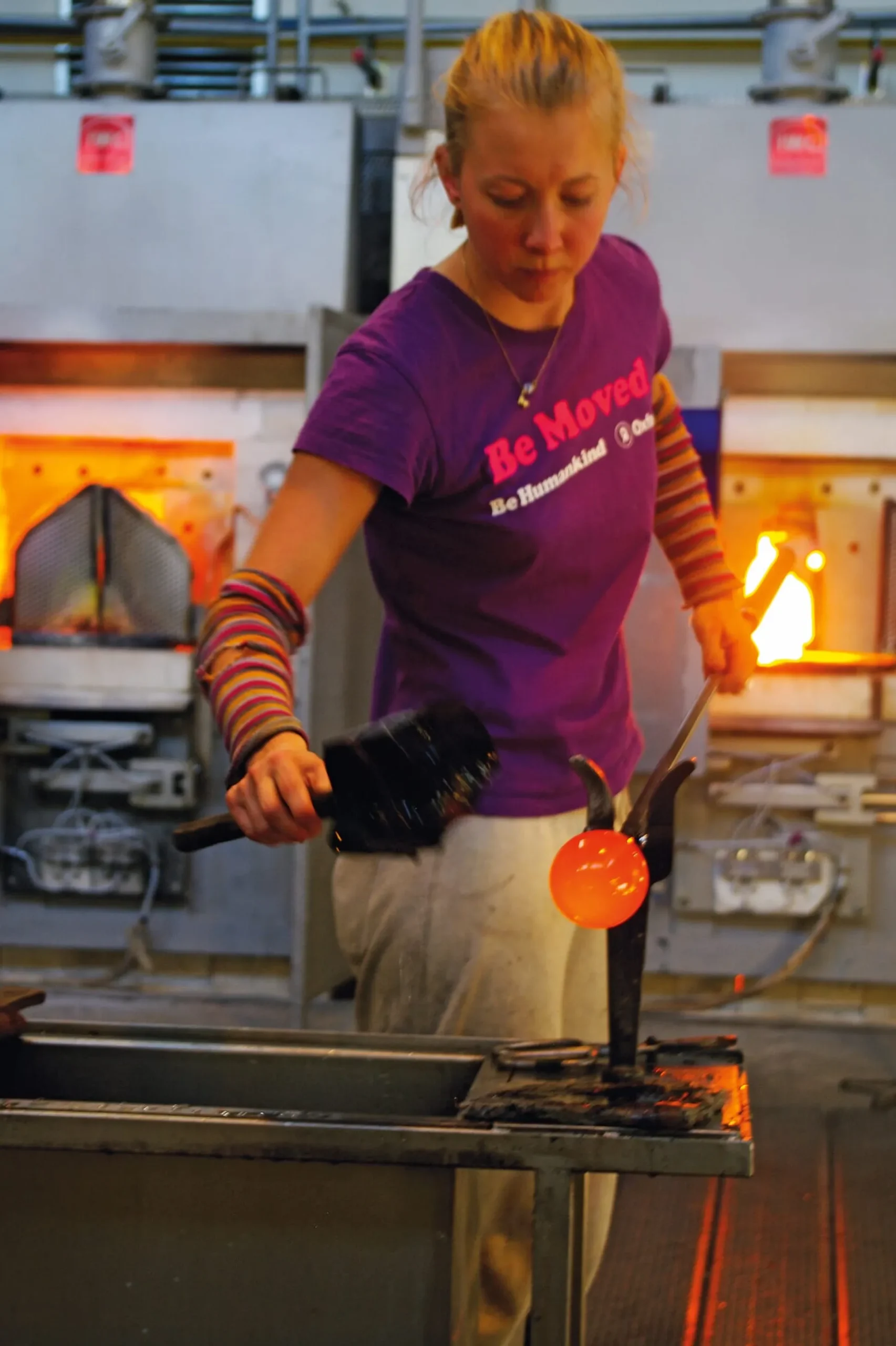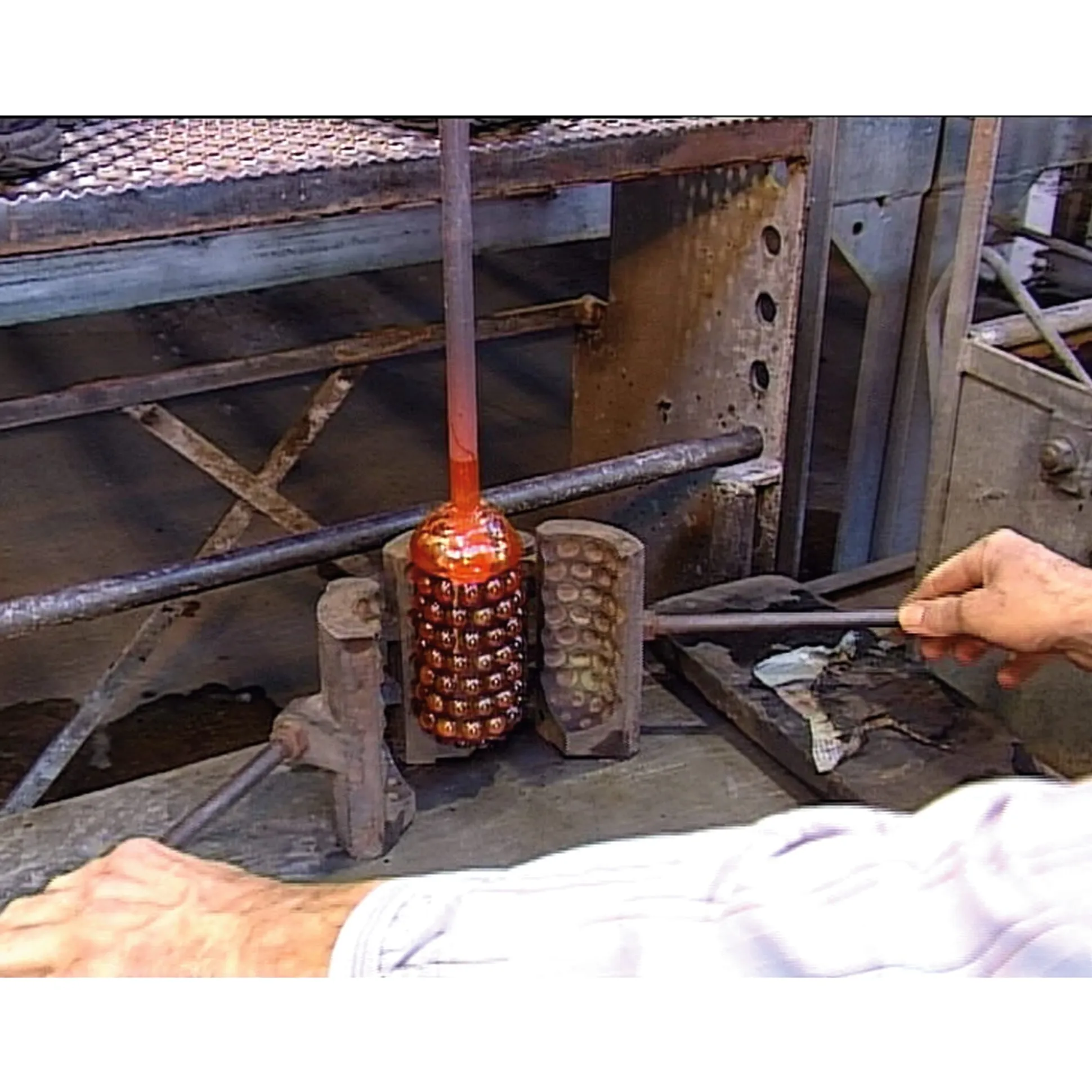 Die ins Längliche gedrehte, heiße Glasmasse stellt der Glasmacher in eine optische Vorform aus Stahl und bläst sie aus, bis die Masse die vorgegebene Gestalt annimmt und sich reliefartige Noppen ausbilden. Noch heiß, wälzt der Glasmacher dann die Masse in Farbmehl, erhitzt sie wieder und formt weiter mit dem Wulgerholz – das Farbglas verbindet sich mit dem Grundkörper. Wieder muss die Pfeife immer in Bewegung bleiben, der Glasmacher nimmt noch einmal Kristallglas auf und bläst unter ständigem Drehen den Posten in die Fertigform aus Buchenholz ein. Am abgeflachten Boden der Schale wird schließlich ein Hefteisen angedrückt, um das Werkstück weiter halten zu können, während an der anderen Seite der Glasmacher die Pfeife abschlägt und mit Hilfe der Auftreibschere den stark erhitzten, noch geschlossenen Rand der Schale weitet und formt – und dreht und dreht.