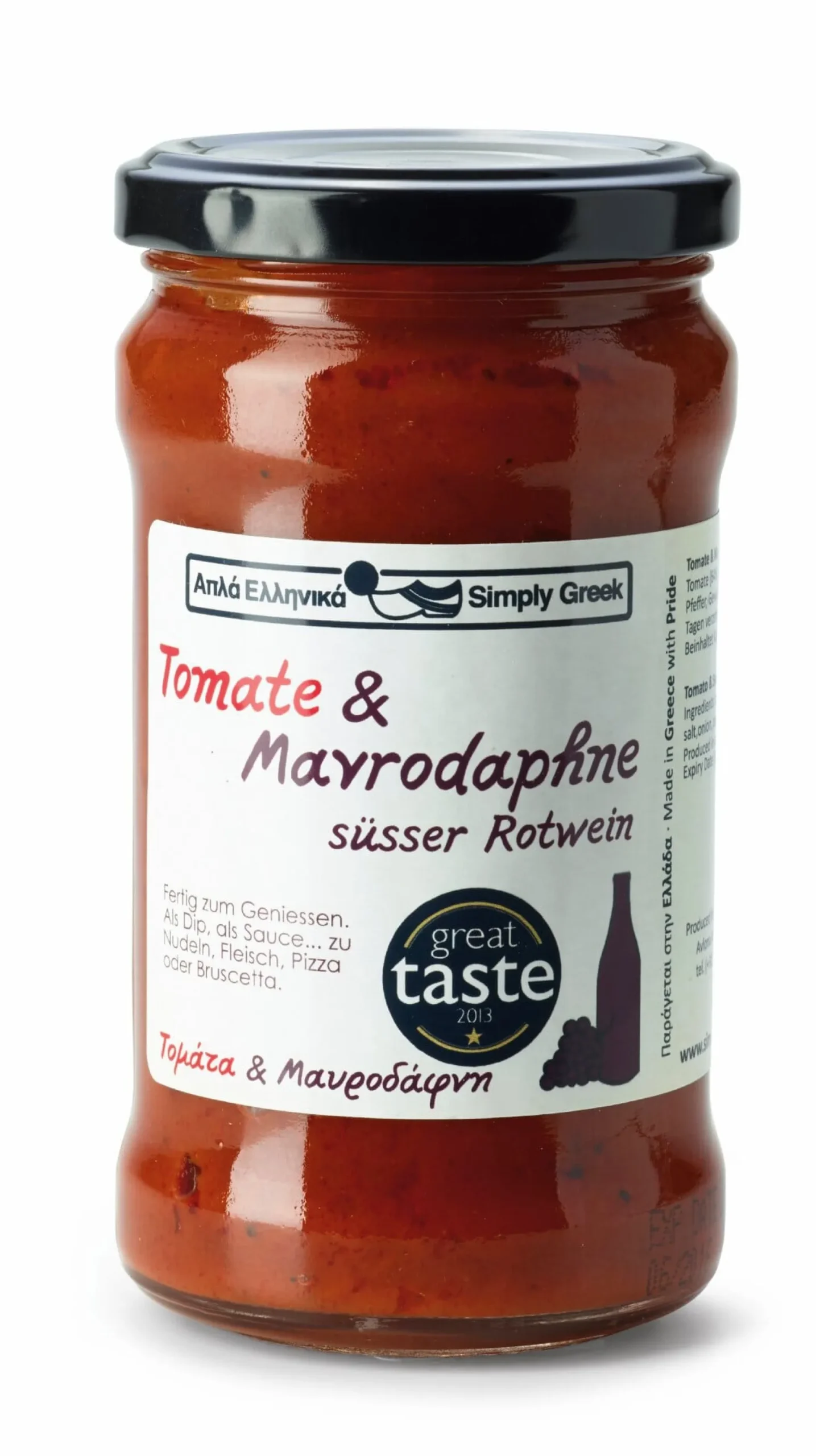 Die Rezeptur dieser köstlichen Sauce verbindet den vollen Geschmack reifer Tomaten mit dem des voluminösen, samtroten Mavrodaphne-Süßweins auf unnachahmliche Weise. Die feinpürierte, cremige Sauce schmeckt zu Nudeln und auf der Pizza, sie verfeinert Hähnchen- und Fleischgerichte, und schließlich eignet sie sich auch als Dip oder Brotaufstrich.