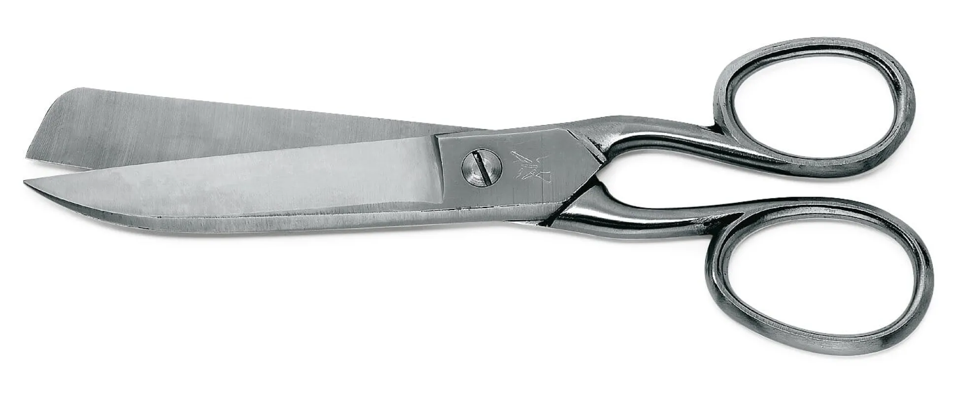 Eine beeindruckende Schere aus dem lederverarbeitenden Gewerbe ist die auch als Sack- oder Buchbinderschere bekannte Grobschere. Die massive Schraube bildet einen stabilen Drehpunkt, die kräftigen Blätter – eines davon mit abgestumpfter breiter Spitze – trotzen auch groben Anforderungen und können bei Bedarf nachgeschliffen werden. Die großzügig dimensionierten Augen gestatten eine komfortable Kraftausübung. Für (fast) jede Art von Textilien, Leder oder Karton.