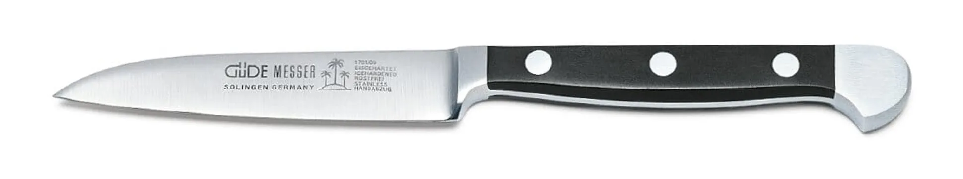 Bei diesem geschmiedeten Messer aus dem 1910 gegründeten Solinger Betrieb von Franz Güde ist am Ende des Griffes ein zweiter Kropf ausgeschmiedet; dieses zusätzliche Gewicht verlagert den Schwerpunkt des Messers nach hinten und gibt ihm damit eine überlegene Balance. Alle Güde-Messer sind aus rostfreiem Messerstahl, eisgehärtet (56 HRC), handabgezogen und handgeschärft. Wir bieten sie in zwei Varianten an: mit Griffschalen aus Pflaumenbaumholz und – wie bei Profimessern aus hygienischen Gründen schon lange üblich – mit solchen aus dem thermoplastischen Kunststoff Polyoxymethylen (POM). Alle Griffschalen sind mit Edelstahlnieten befestigt.