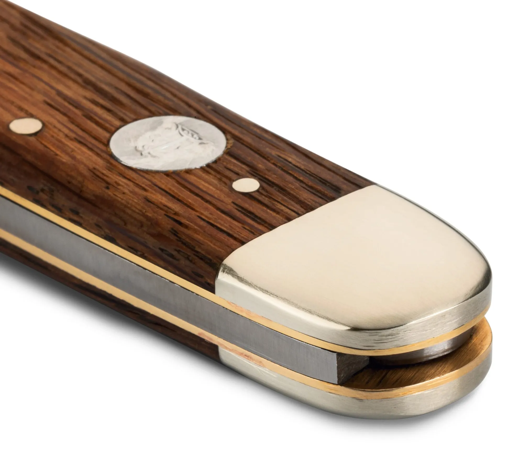 Das Herrenmesser birgt die gattungstypisch vorgesehenen Werkzeuge – eine geschmiedete und in Handarbeit gepließtete Edelstahlklinge, einen Korkenzieher aus gehärtetem Stahl, einen Kapselheber und einen (Schlitz-) Schraubendreher. Jedes Taschenmesser wird einzeln von Hand ausgemacht und qualitätskontrolliert. Die Heftschalen werden aus dem Holz gebrauchter Eichenfässer gefertigt. Je nachdem, welche Seite des Materials zu sehen ist – die vom Wein gefärbte Innenseite oder die angewitterte äußere –, fallen Ton und Maserung unterschiedlich aus. Kein Messer gleicht dem anderen.