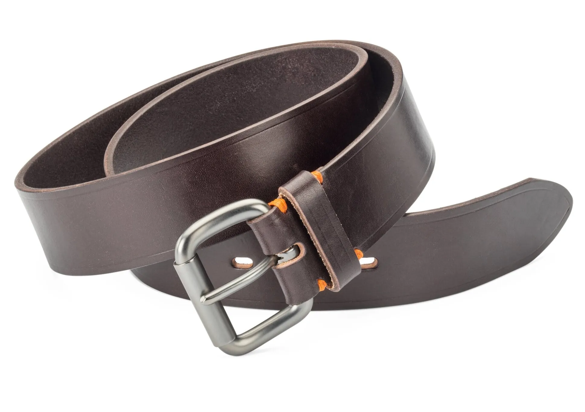 Einlagiger Gürtel aus braunem Glattleder der Gerberei Kobel in Kellinghusen. Es stammt aus den Kernstücken (Doppelcroupons), dem stabilsten und wertvollsten Teil der Rinderhaut. Der Gürtel zeigt eine feine, umlaufende Zierprägung, die dunkle, mit Rolle gearbeitete Schließe ist mittels kontrastierendem Sattlerstich angenäht.