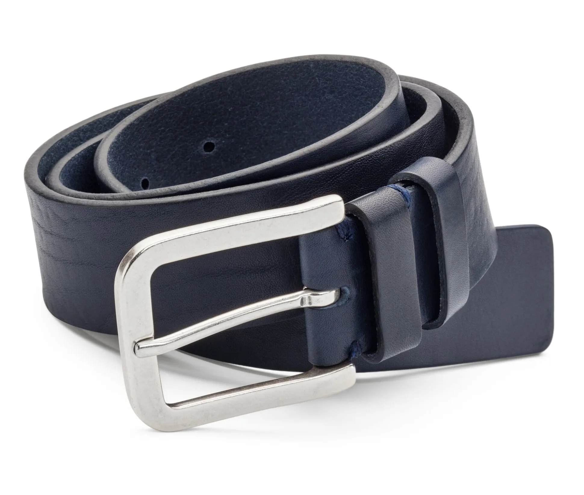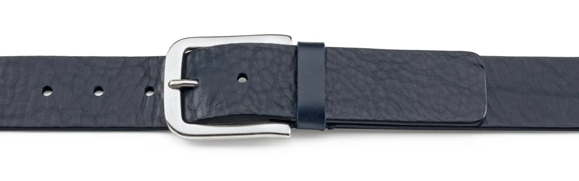 Die Basis dieses einlagigen Gürtels ist ein pflanzlich gegerbtes Rindleder deutscher Herkunft. Es zeigt ein natürliches, markantes Narbenbild und wurde im Fass in kräftigem Dunkelblau durchgefärbt. Die solide Gürtelschließe aus versilbertem Messing passt perfekt zu dem charaktervollen Leder.