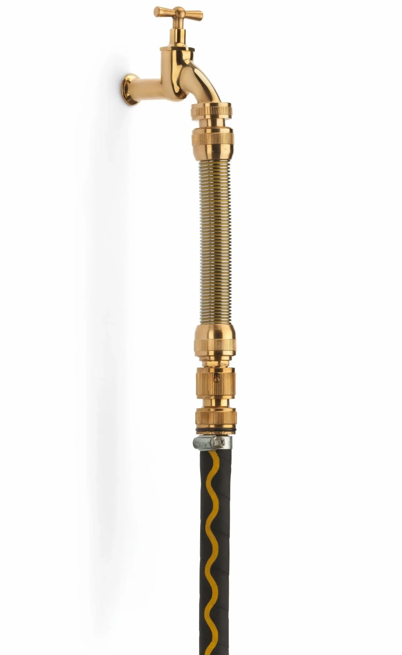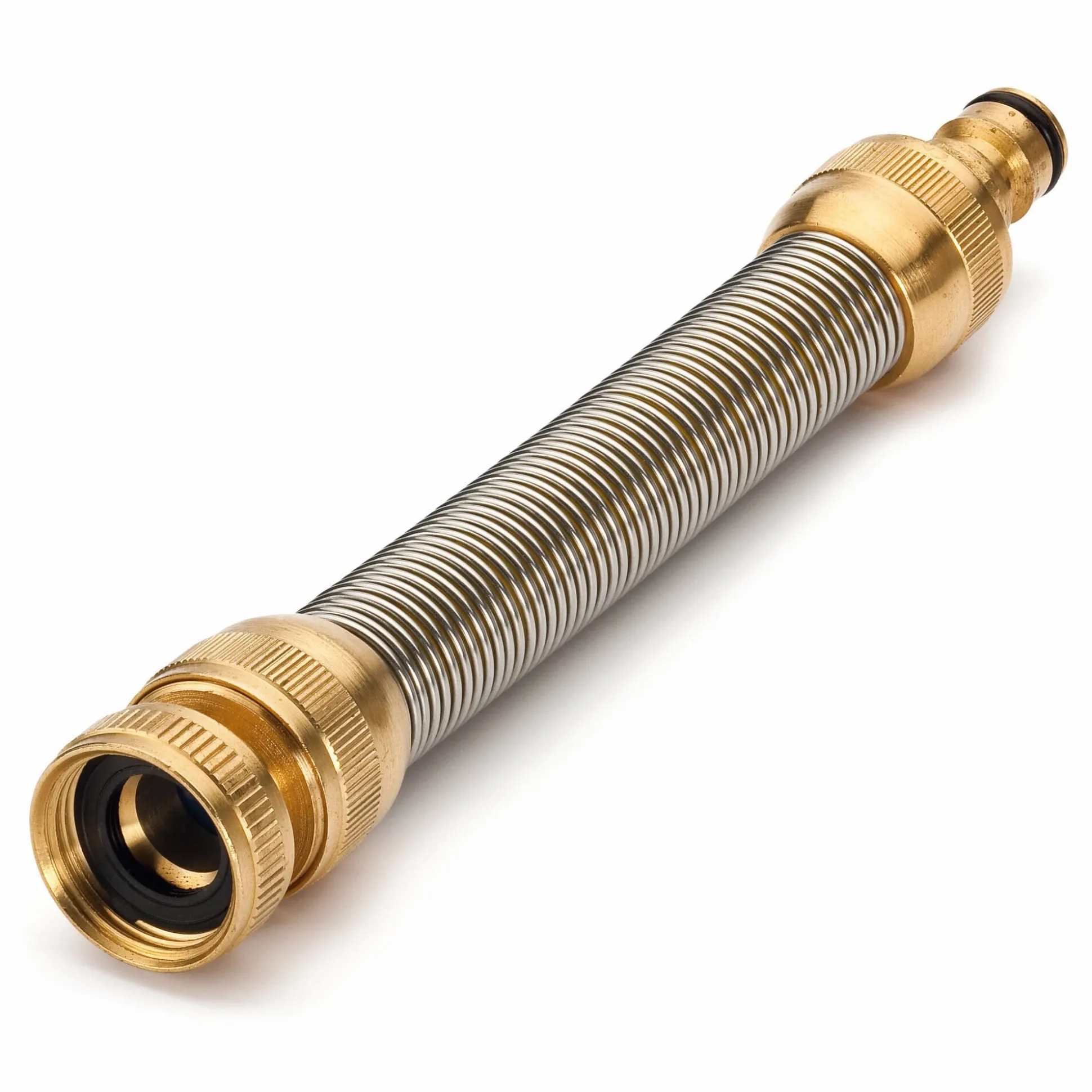 Biegsames Verbindungsstück zwischen Gartenschlauch und Hahnanschluss. Die stabile Spirale fängt jede Schlauchbewegung auf und verhindert als eine Art „Puffer“, dass ersterer abknickt oder sich bei ruckartigem Ziehen und Zerren am anderen Ende dauerhaft verdreht.