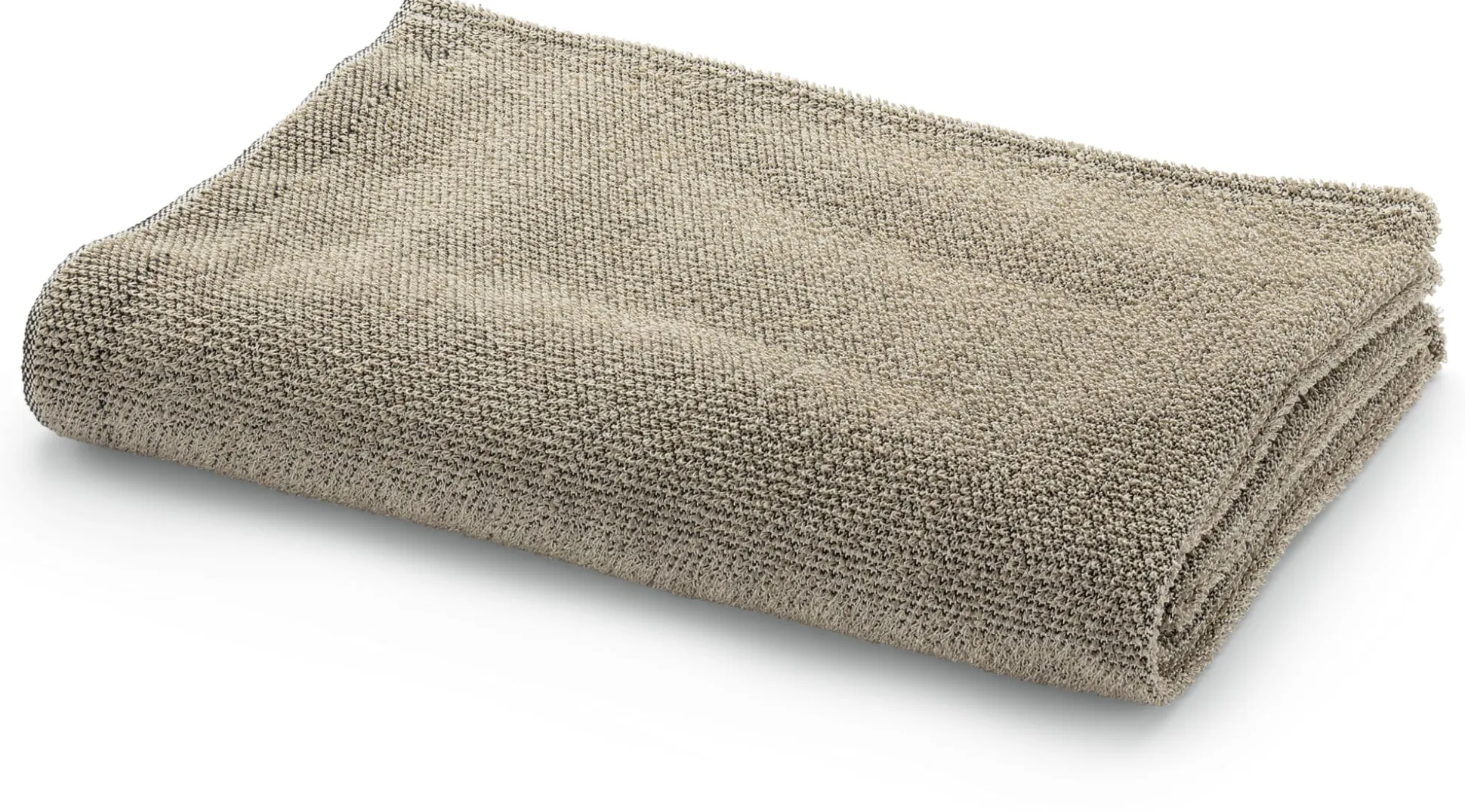 Jokipiin Pellava in Finnland webt dieses einzigartige Leinenfrottiertuch aus Leinen und Baumwolle. Aufgrund seines hohen Leinenanteils von 70% hat es eine massierende Wirkung und bietet sich daher vor allem für eine Nutzung in der Sauna an. Das helle Tuch ist unifarben in gebrochenem Weiß gehalten. Ein etwas dunklerer Ton entsteht bei der Farbvariante „Schwarz-Natur“ durch Verwendung eines schwarzen Baumwollzwirns im Schuss. In der Kette wird ungebleichter, ungefärbter Baumwollzwirn und in der Schlingenkette ungefärbtes und ungebleichtes Leinengarn verwendet.