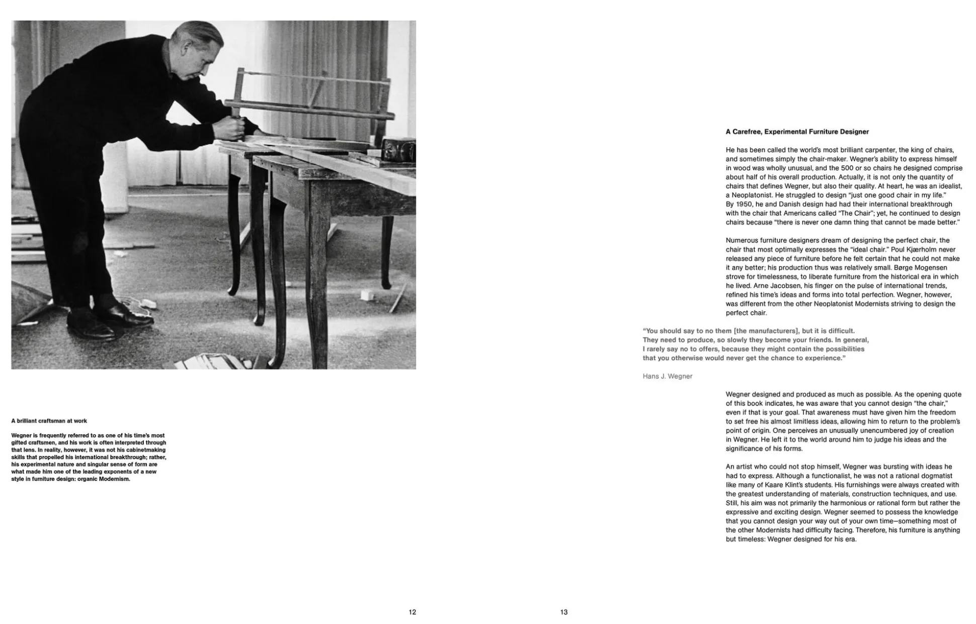 The name Hans J. Wegner (1914–2007) is inseparable from his unrivalled chairs, which helped Danish design to achieve its international breakthrough. Every design fan has his or her favorite from among Wegner’s approximately five hundred creations. Today, there is a hardly a glossy interior design magazine that does not include an illustration of the elegant China Chair (1943) or the Y Chair (1950), and even John F. Kennedy sat on his Round Chair, which is now simply called The Chair (1949). Trained as a furniture maker, Wegner usually made his prototypes himself by hand, using traditional joinery techniques such as tongue-and-groove or finger joints. In the process he pushed the limitations of wood, giving his designs an unmatched elegance. His sense of humor did not fall by the wayside, either, as evidenced by his splendid Peacock Chair (1947) or the masculine Ox Chair (1960), that latter of which is available with or without horns.
