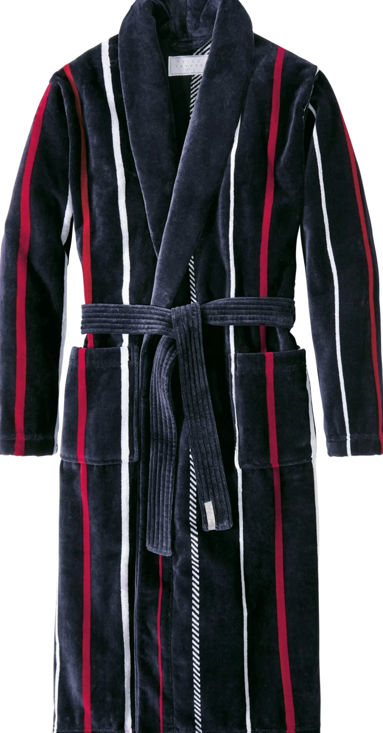 Dieser Hausmantel entsteht aus einem in aufwendiger Webtechnik hergestellten Gewebe, das auf der einen Seite aus kuschelig-weichem Velours und auf der anderen Seite aus saugfähigem Frottier besteht. Für den Velours auf der Außenseite des Bademantels werden die im Grundgewebe verankerten Schussfäden aufgeschnitten und zu voluminösem Velours „geschoren“. Die Schlingen des Frottiergewebes auf der Innenseite des Mantels sorgen für eine vergrößerte Oberfläche und dadurch für größere Saugkraft. So entsteht ein 450 g/qm schwerer Stoff, aus dem in Portugal dieser bequeme und kuschelige Haus- und Bademantel konfektioniert wird. Und dank der üppigen Qualität sind Sie damit nicht nur im Haus, sondern auch für einen kurzen Gang in den Garten oder zum Briefkasten bestens angezogen. Der Haus- und Bademantel ist mit zwei aufgesetzten Taschen, einem Schalkragen und gestepptem Bindegürtel versehen.